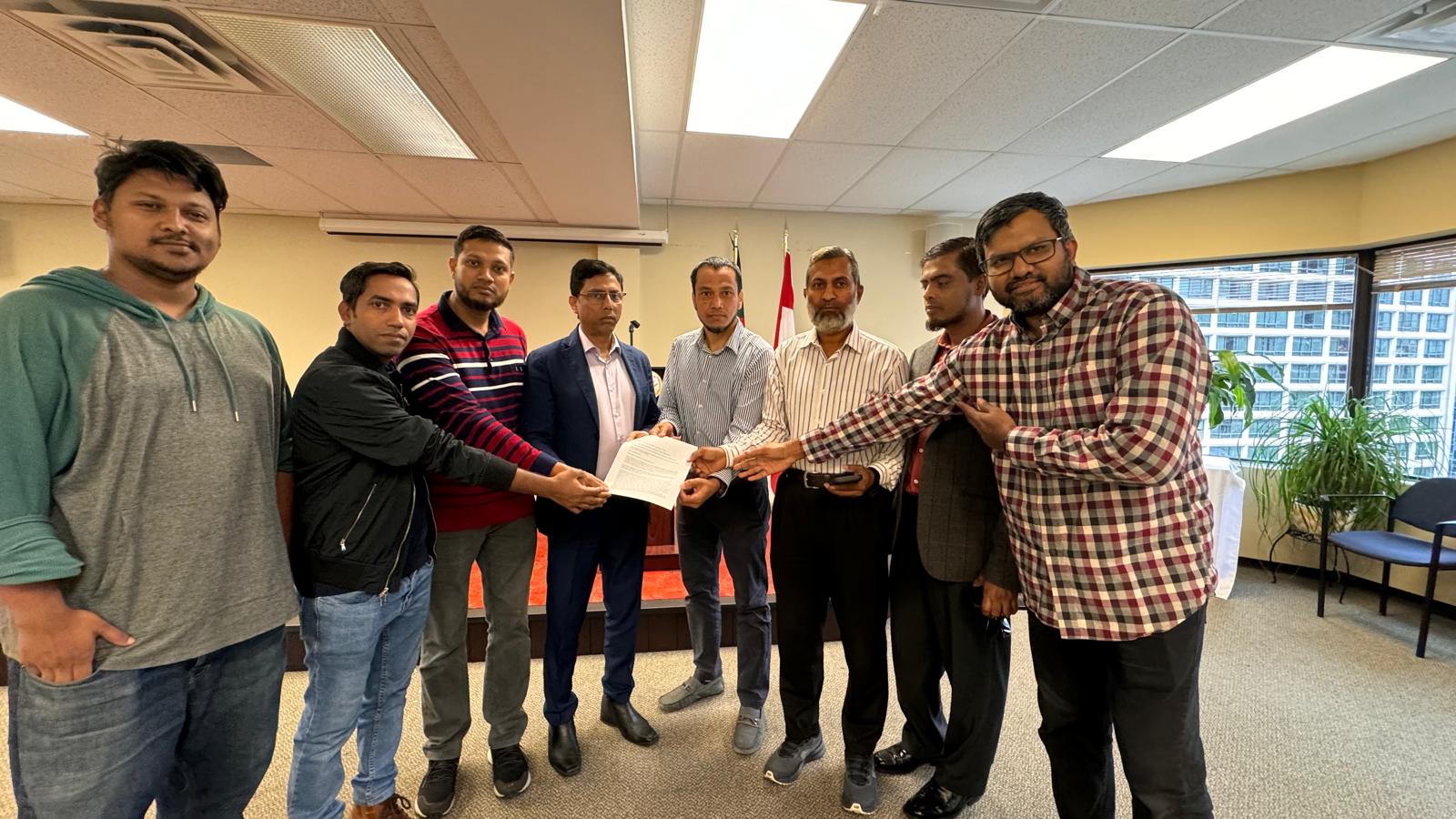 বাংলাদেশ কমিউনিটির পক্ষ থেকে মিসবাহুল ইসলাম, মাসউদ আব্দুল্লাহ, লুতফর রহমান, নজরুল ইসলাম, মুসতাসিম বিল্লাহ, মনোয়ার হোসেন, মনজুর মোর্শেদ, এবং নজরুল রহমান সহ অন্যান্য নেতৃবৃন্দ হাইকমিশনে গিয়ে স্মারকলিপি পেশ করেন।