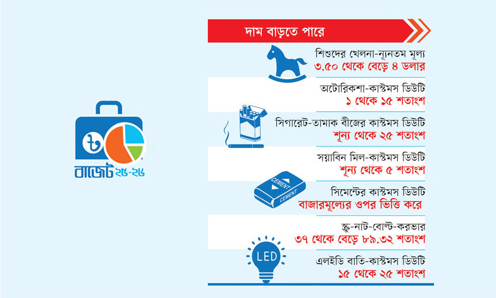 মুক্তমন ডেস্ক : ২০২৫-২৬ অর্থবছরের জন্য প্রস্তাবিত বাজেটের আকার ধরা হয়েছে ৭ লাখ ৯০ হাজার কোটি টাকা। বাজেটে রাজস্ব আদায় ও দেশীয় শিল্প সুরক্ষায় বেশকিছু পণ্যের ওপর কর, শুল্ক ও ভ্যাট আরোপ করতে যাচ্ছে সরকার। যার প্রভাবে বাজারে কিছু পণ্যের দাম বাড়ার আশঙ্কা রয়েছে।