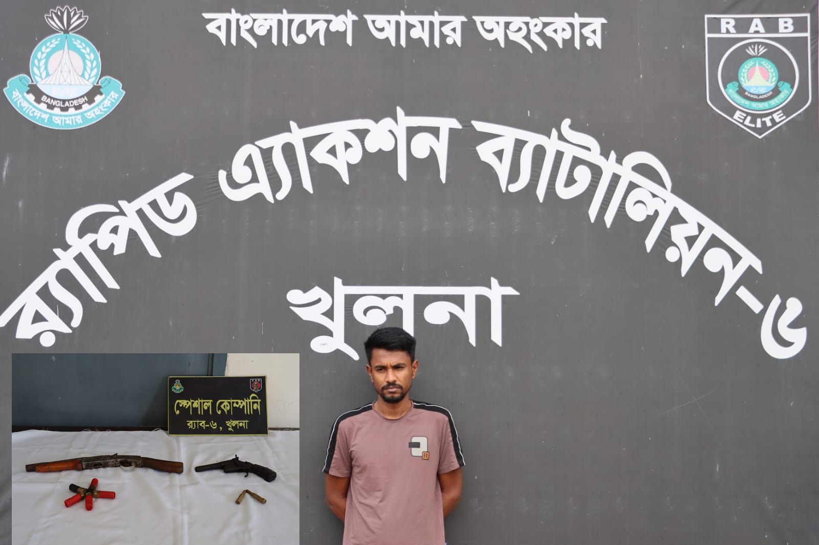 রাতে তাকে নিয়ে পরিচালিত পৃথক অভিযানে তার বাড়ির ভেতর থেকে একটি দেশীয় তৈরি শর্টগান, একটি ওয়ান শুটারগান, পাঁচ রাউন্ড শর্টগানের গুলি এবং দুই রাউন্ড ৭.৬২ মি.মি. গুলি উদ্ধার করা হয়।
