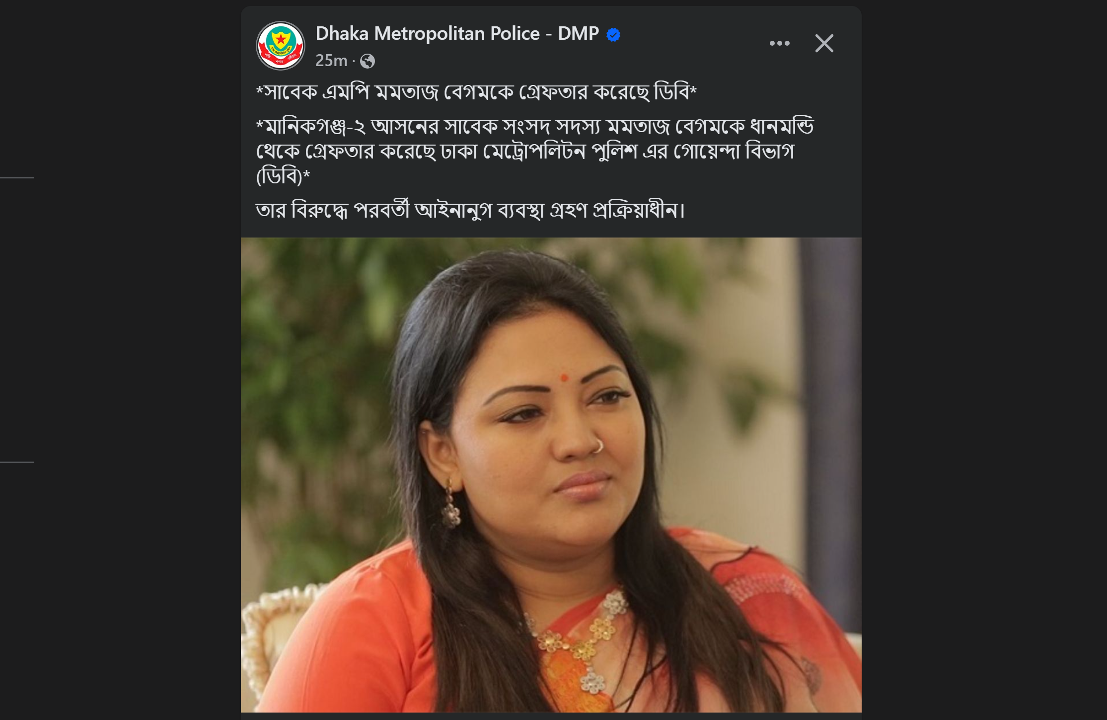 মুক্তমন রিপোর্ট : মানিকগঞ্জ-২ আসনের সাবেক এমপি মমতাজ বেগমকে ধানমন্ডি থেকে গ্রেপ্তার করেছে ঢাকা মেট্রোপলিটন পুলিশ এর গোয়েন্দা বিভাগ (ডিবি)। সোমবার (১২ মে) রাত পৌনে ১২ টায় তাকে গ্রেপ্তার করা হয়।