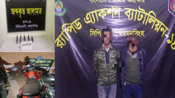 মুক্তমন রিপোর্ট :ময়মনসিংহে র‍্যাব-১৪ এর অভিযানে ১৪ বোতল ফেন্সিডিলসহ দুই মাদককারবারিকে গ্রেফতার করা হয়েছে। মঙ্গলবার (০৪ ফেব্রুয়ারি ২০২৬) বিকাল আনুমানিক ৪টা ৪৫ মিনিটে গোপন সংবাদের ভিত্তিতে ময়মনসিংহ সিপিএসসি, র‍্যাব-১৪ এর একটি আভিযানিক দল ময়মনসিংহ জেলার মুক্তাগাছা থানাধীন ভাবকির মোড় সংলগ্ন মেসার্স জান্নাত ফার্নিচারের সামনে ময়মনসিংহ-জামালপুর মহাসড়কে চেকপোস্ট স্থাপন করে এ অভিযান পরিচালনা করে।