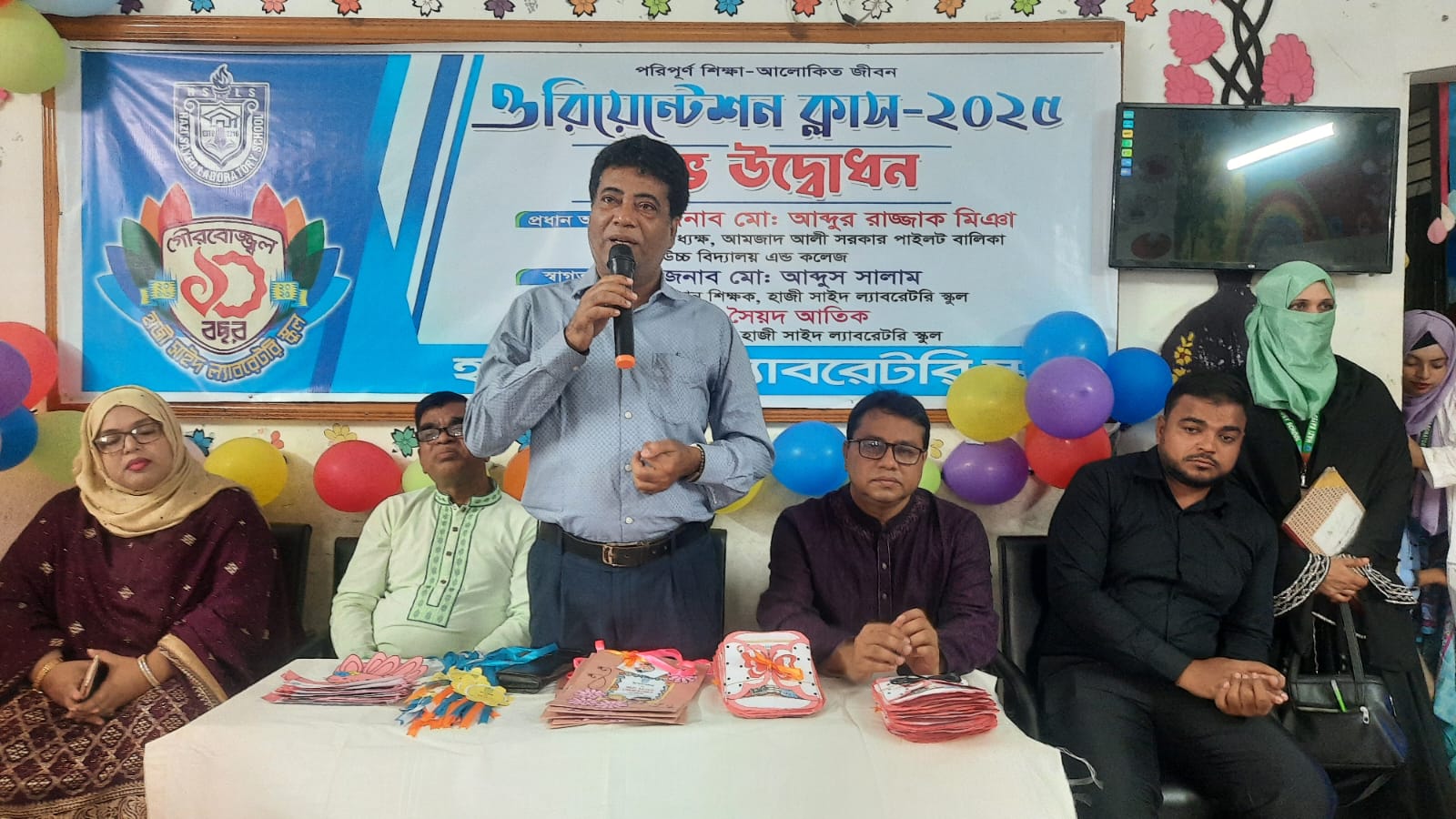 স্টাফ রিপোর্টার : টংগীর স্বনামধন্য শিক্ষা প্রতিষ্ঠান হাজী সাইদ ল্যাবরেটরি স্কুলের ওরিয়েন্টেশন ক্লাস শুরু হয়েছে। এ উপলক্ষে শনিবার সকালে এক উদ্বোধনী অনুষ্ঠানের আয়োজন করা হয়। হাজী সাইদ ল্যাবরেটরি স্কুলের প্রতিষ্ঠাতা সৈয়দ আতিক এর সভাপতিত্বে উদ্বোধনী অনুষ্ঠানে প্রধান অতিথি হিসেবে উপস্থিত ছিলেন আমজাদ আলী সরকার পাইলট বালিকা উচ্চ বিদ্যালয় এন্ড কলেজের অধ্যক্ষ মো: আব্দুর রাজ্জাক মিঞা। স্বাগত বক্তব্য রাখেন সহকারী প্রধান শিক্ষক নাজিম উদ্দিন। বিশেষ অতিথি হিসেবে উপস্থিত ছিলেন উত্তরা পরশমণি ল্যাবরেটরি স্কুলের সিনিয়র শিক্ষক আতিকুর রহমান আতিক, সিনিয়র শিক্ষক রোকসানা আক্তার, আবু তাহের, সাজ্জাদ নাদিম সাজু, পপি আক্তার প্রমুখ।