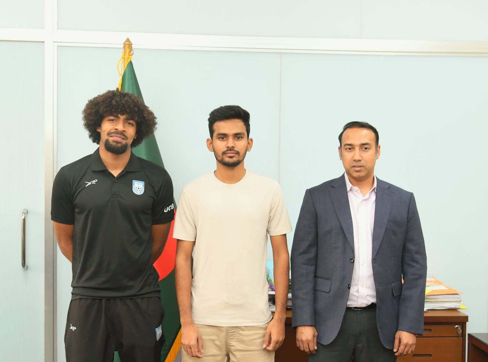 রাজধানীর নগর ভবনে যুব ও ক্রীড়া মন্ত্রণালয় এবং স্থানীয় সরকার, পল্লী উন্নয়ন ও সমবায় মন্ত্রণালয়ের মাননীয় উপদেষ্টা আসিফ মাহমুদ সজীব ভূঁইয়ার সঙ্গে আজ (বুধবার) দুপুর আড়াইটায় সৌজন্য সাক্ষাৎ করেন বাংলাদেশ ফুটবলের নতুন সম্ভাবনা হামজা চৌধুরী। এসময় তার সঙ্গে উপস্থিত হয়ে ফুটবলে সৃষ্ট চলমান সঙ্কট নিয়ে ক্রীড়া উপদেষ্টার সঙ্গে আলোচনায় বসেন বাংলাদেশ ফুটবল ফেডারেশনের (বাফুফে) সভাপতি জনাব তাবিথ আউয়াল।