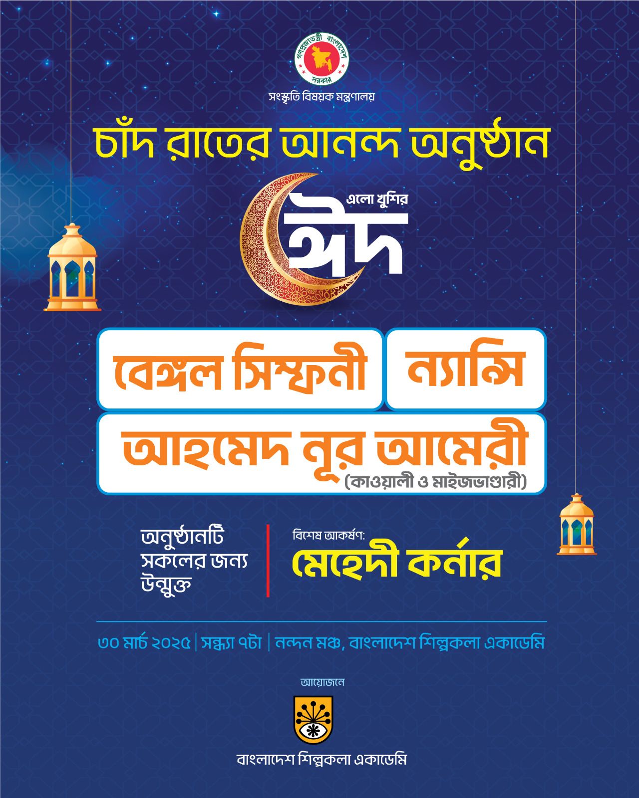 মুক্তমন রিপোর্ট : ঈদ-উল ফিতর উপলক্ষ্যে বাংলাদেশ শিল্পকলা একাডেমির আয়োজনে রাজধানীর সেগুনবাগিচায় একাডেমির নন্দনমঞ্চে অনুষ্ঠিত হতে যাচ্ছে মনোজ্ঞ পরিবেশনা “চাঁদরাতের আনন্দ অনুষ্ঠান”। সংস্কৃতি বিষয়ক মন্ত্রণালয়ের পৃষ্ঠপোষকতায় প্রথমবারের মতো এ আয়োজন অনুষ্ঠিত হবে আগামিকাল রোববার সন্ধ্যা ৭.০০ টায়। ব্যান্ডদল বেঙ্গল সিম্ফনী, জনপ্রিয় কন্ঠশিল্পী ন্যান্সি এবং কাওয়ালী ও মাইজভান্ডারী পরিবেশনায় থাকবেন আহমেদ নূর আমেরী।
