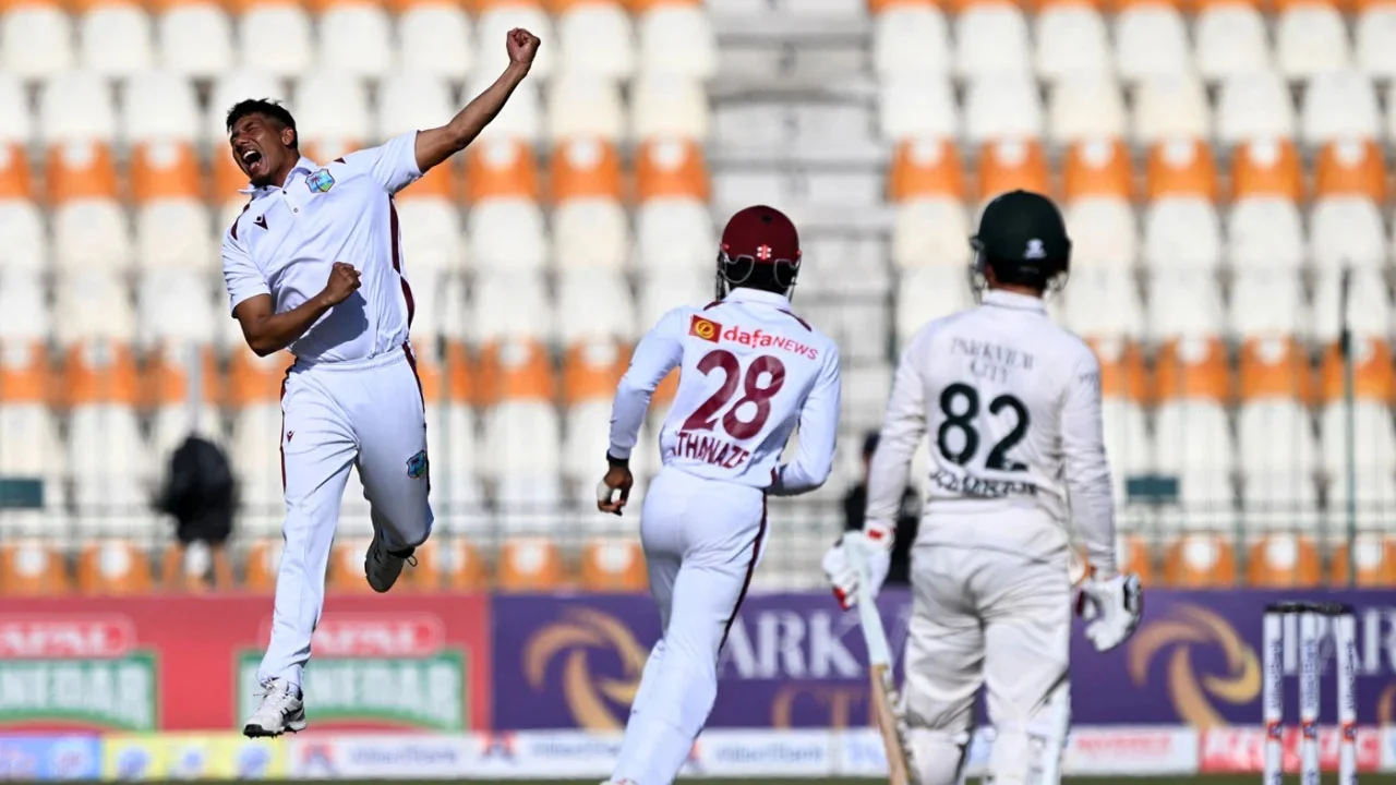 জবাব দিতে নেমে ওয়ারিকান ও মোতির স্পিন ঘূর্ণিতে ১৫৪ রানে গুটিয়ে যায় পাকিস্তান। স্বাগতিকদের হয়ে মোহাম্মদ রিজওয়ান ও সৌদ শাকিল ছাড়া আর কোনো ব্যাটার ওয়েস্ট ইন্ডিজের বোলারদের সামনে লড়াই করতে পারেননি। ফিফটি থেকে এক রান দূরে থেকে আউট হন রিজওয়ান। ৩২ রান আসে শাকিলের ব্যাট থেকে। সমান ১৬ রান করেন কামরান গোলাম ও সাজিদ খান। ৪ উইকেট নেন ওয়ারিকান। মোতির শিকার ৩টি।