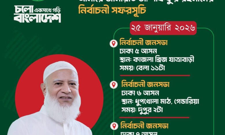 বাংলাদেশ জামায়াতে ইসলামীর আমীর ডা. শফিকুর রহমান আজ শনিবার (২৫ জানুয়ারি ২০২৬) ঢাকা মহানগরী দক্ষিণে একাধিক নির্বাচনী জনসভা ও গণসংযোগে অংশ নেবেন। নির্বাচনী প্রচারণার অংশ হিসেবে তিনি ঢাকা-৫, ঢাকা-৬ ও ঢাকা-৭ আসনে ধারাবাহিক জনসভায় বক্তব্য রাখবেন।