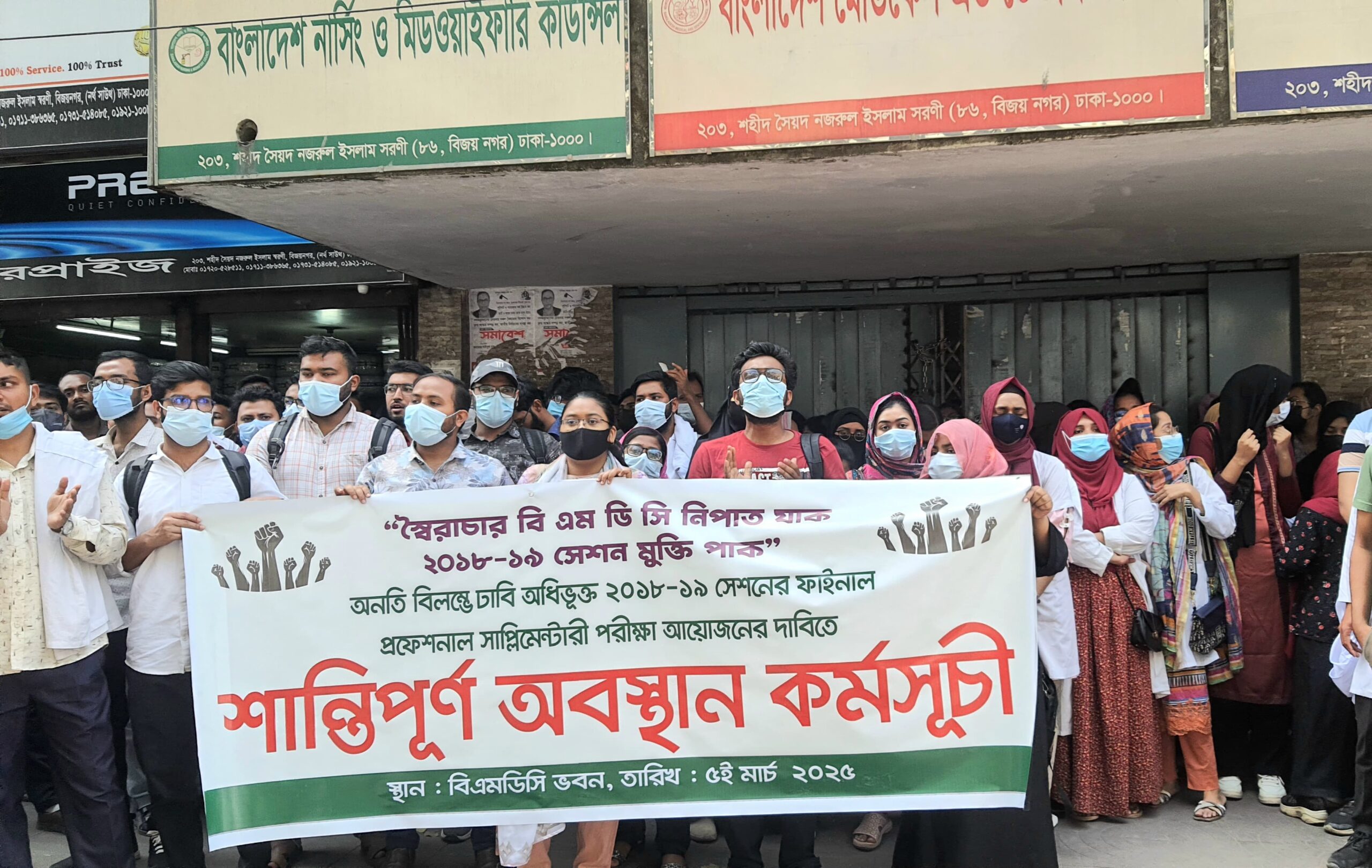 এদিকে বিএমডিসি রেজিস্ট্রার ডা. মো. লিয়াকত হোসেন বলেন, ‘গত বছরের নভেম্বরে ঢাকা বিশ্ববিদ্যালয়ের অধীনে অনুষ্ঠিত এমবিবিএস পরীক্ষায় উত্তীর্ণ হতে পারেনি এমন এক হাজারের মত শিক্ষার্থী আছে। মে মাসে পরীক্ষার যে সূচি হয়, সেখানেও অনুত্তীর্ণদের অংশ নেওয়ার সুযোগ আছে। এটাই হলো নিয়ম, এর বাইরে পরীক্ষা নেওয়ার কোনো সুযোগ নেই। তারা চাচ্ছে একটা মধ্যবর্তী পরীক্ষা, কিন্তু এটা সম্পূর্ণ আইন বহির্ভূত একটা কাজ। পরীক্ষা কিভাবে নেবে, রুটিন কি হবে সেটা ঠিক করে ডিন অফিস। শিক্ষার্থীরা দাবি করছে তাদের টাইমমত পরীক্ষা নিতে হবে নইলে তারা পিছিয়ে যাবে। একটা সহজ বিষয়কে বিএমডিসির ওপর চাপিয়ে জটিলতা তৈরি করা হয়েছে।’