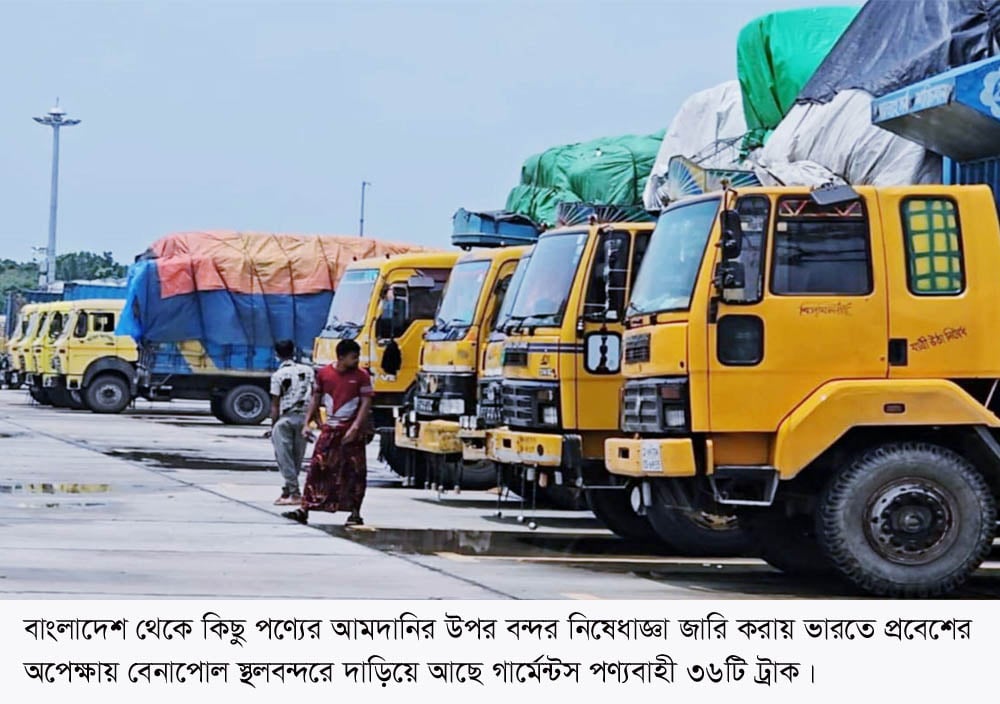 বেনাপোল কাস্টম ক্লিয়ারিংএন্ড ফর ওয়ার্ডিং এজেন্ট স্টাফ এসোসিয়েশনের সভাপতি মুজিবর রহমান বলেন, ভারত সরকার স্থলবন্দর দিয়ে কিছু পণ্যের আমদানি নিষেধাজ্ঞা জারি করায় বেনাপোল স্থলবন্দরে ৩৬টি গার্মেন্টস পণ্য বোঝাই ট্রাক ভারতে প্রবেশের অপেক্ষায় দাড়িয়ে রয়েছে। এছাড়া, বন্দরের বাহিরে আরও ৫০/৬০টি ট্রাক অপেক্ষা করছে।