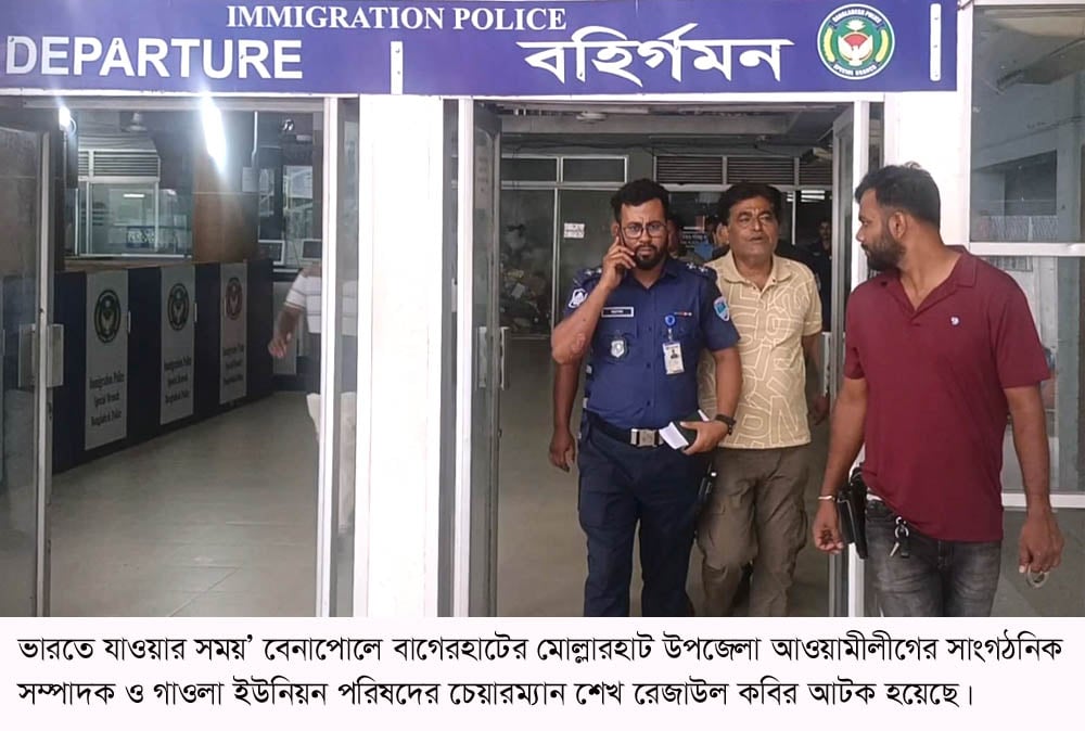 মসিয়ার রহমান কাজল,বেনাপোলঃ বেনাপোল চেকপোস্ট দিয়েভারতে যাওয়ার সময় বাগেরহাট জেলার মোল্লারহাট উপজেলা আওয়ামীলীগের সাংগঠনিক সম্পাদক ও গাওলা ইউনিয়ন পরিষদের চেয়ারম্যান শেখ রেজাউল কবির আটক হয়েছে।