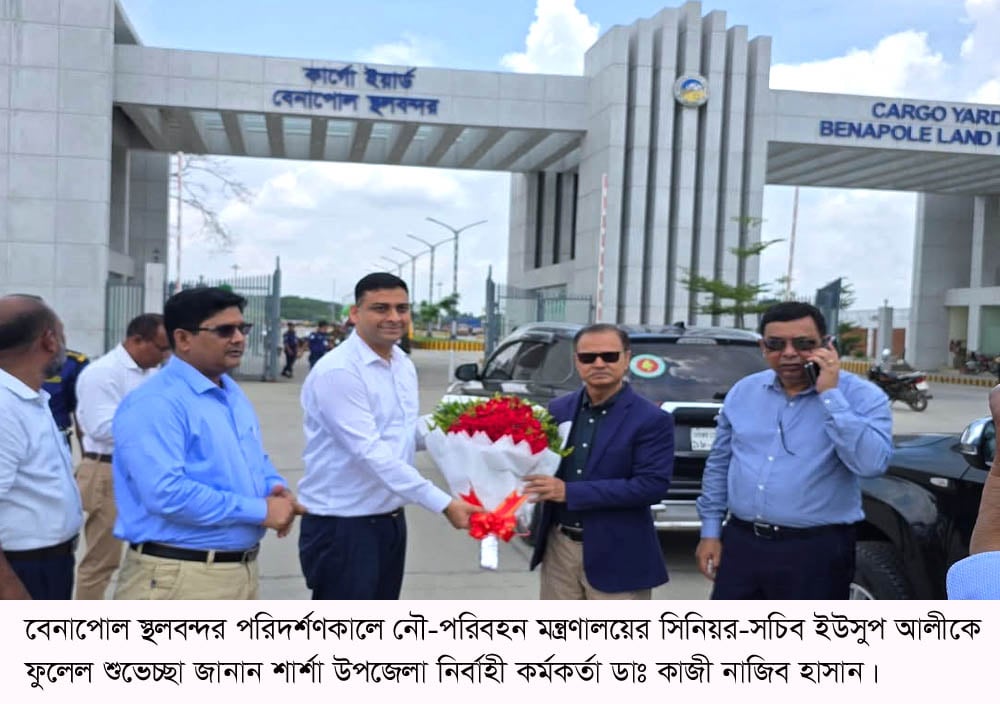 এ বিষয়ে শার্শা উপজেলা নির্বাহি কর্মকর্তা কাজী নাজিব হাসান জানিয়েছেন, বেনাপোল স্থলবন্দরের কার্যক্রম পরিদর্শন করেছেন নৌ-পরিবহন মন্ত্রণালয়ের সিনিয়র সচিব এবং বাংলাদেশ স্থল বন্দর কর্তৃপক্ষের চেয়ারম্যান।