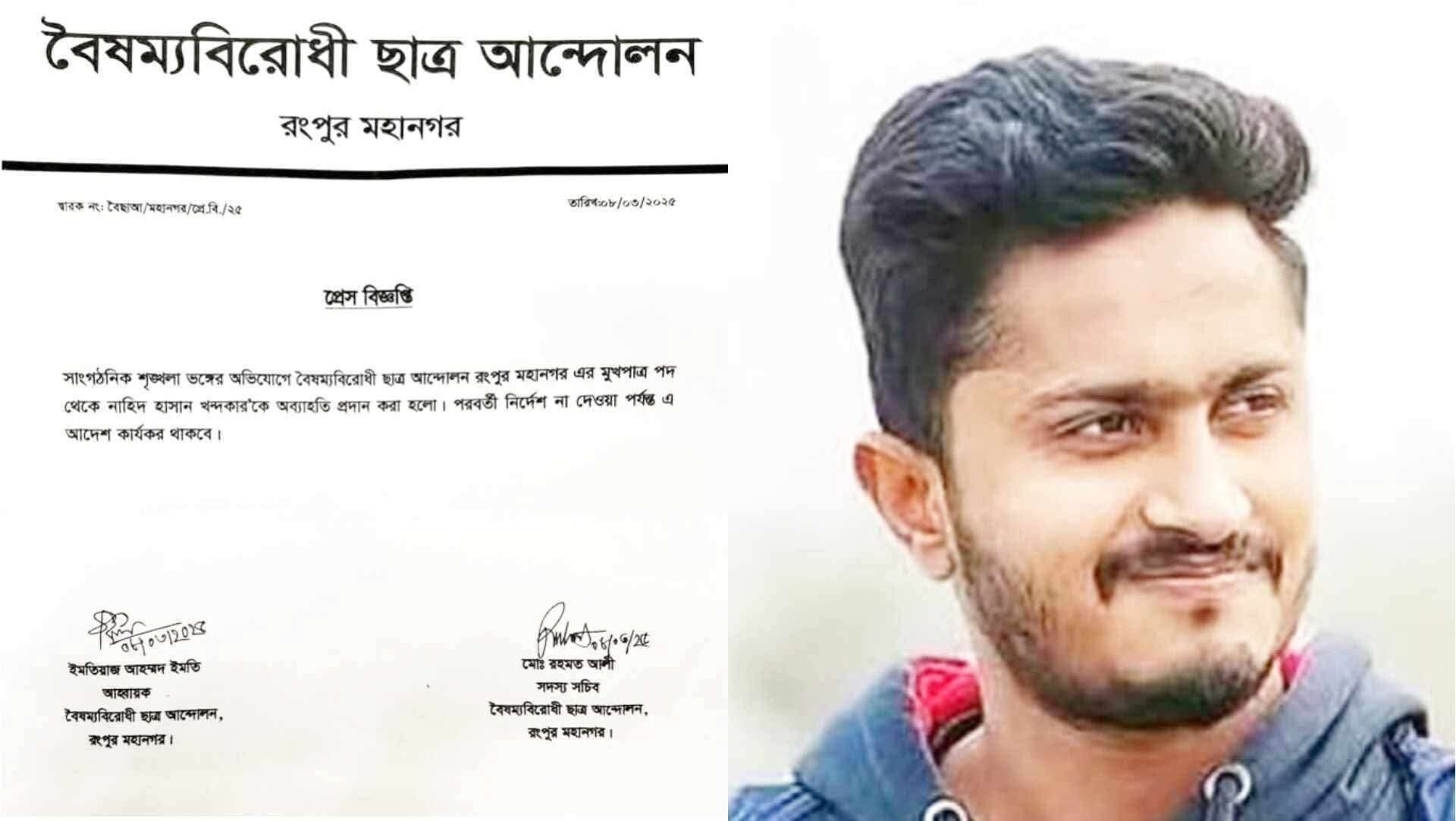 তার পদ থেকে অব্যাহতি দেওয়া হয়েছে। সম্প্রতি একটি বালু মহালে গিয়ে চাঁদাবাজি'র চেষ্টা করে বলে অভিযোগ উঠে। পরে বৈষম্য বিরোধী ছাত্র আন্দোলন তাকে ৩ দিনের মধ্যে জবাব দেওয়ার জন্য কারণ দর্শানোর নোটিশ দেয়। এ ব্যাপারে ৮ মার্চ নোটিশ প্রদানকারী বৈষম্য বিরোধী ছাত্র আন্দোলন রংপুর মহানগর কমিটির মূখ্য সংগঠক আলী মিলনের সঙ্গে যোগাযোগ করা হলে তিনি জানায় নাহিদ হাসান খন্দকারকে তার পদ থেকে অব্যাহতি দেওয়া হয়েছে। তার ব্যাপারে চুড়ান্ত সিদ্ধান্ত সিদ্ধান্ত নেবে কেন্দ্রীয় কমিটি। এর আগে শনিবার ১ মার্চ একটি ভিডিও সামাজিক যোগাযোগ মাধ্যম ফেসবুকে ছড়িয়ে পড়লে আলোচনা সমালোচনা শুরু হয়। ভিডিওতে শোনা গেছে, বৈষম্যবিরোধী ছাত্র আন্দোলনের রংপুর মহানগরের মুখপাত্র নাহিদ হাসান খন্দকারের সঙ্গে এক ব্যক্তির টাকা নিয়ে দরকষাকষি হচ্ছে।