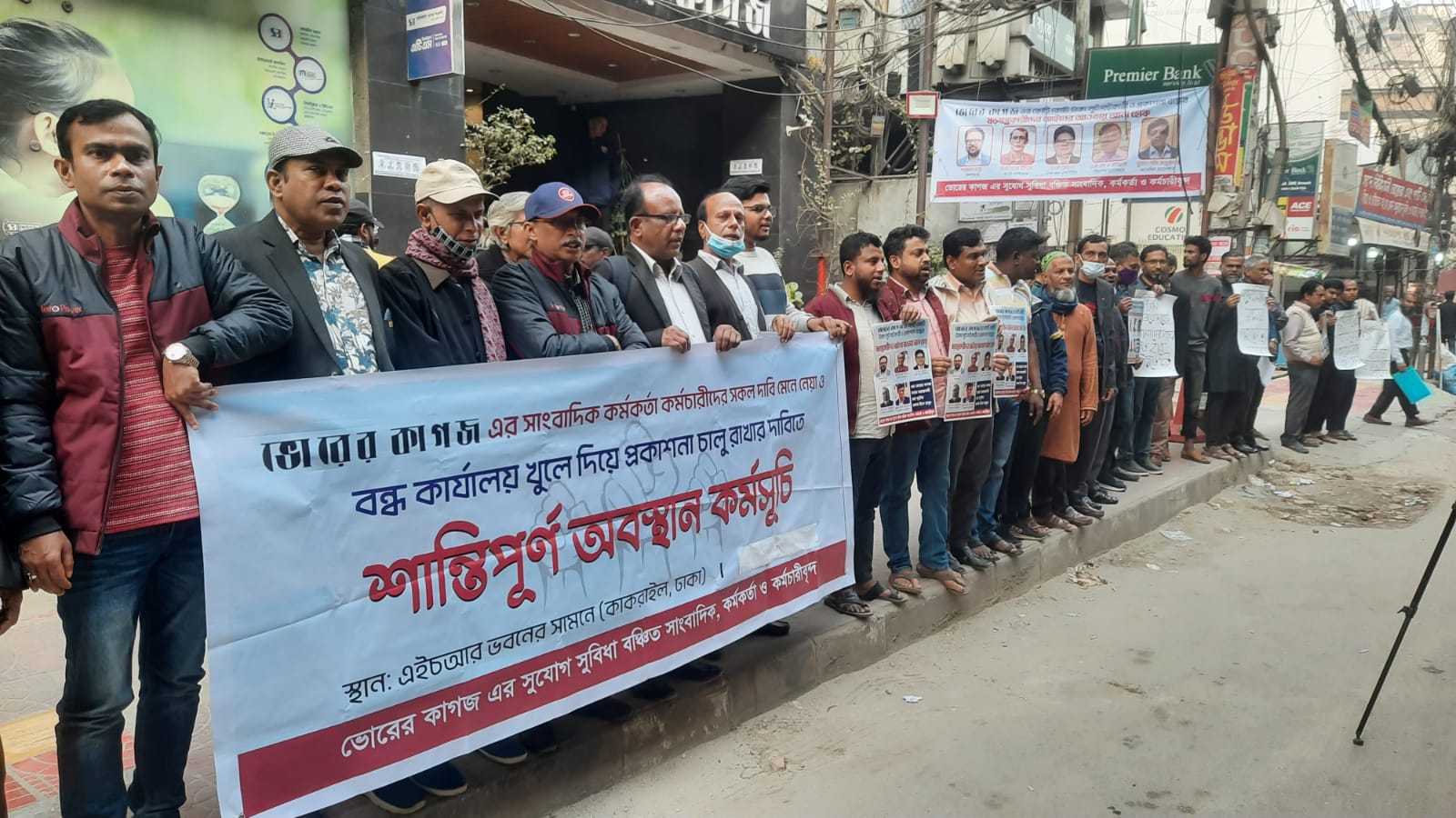 প্রসঙ্গত, ভোরের কাগজ ৮ম ওয়েজ বোর্ড বাস্তবায়ন করেছে- এমন ঘোষণা দিয়ে সরকার থেকে ৯০০/-টাকা কলাম ইঞ্চি বিজ্ঞাপনসহ সকল সুযোগ-সুবিধা নিয়েছে। অথচ সাংবাদিক-কর্মচারিদের ওয়েজ বোর্ডের বেতন স্কেলের সকল সুযোগ সুবিধা থেকে বঞ্চিত করেছে। এমনকি কোনো নিয়োগপত্র দেয়নি। আজকের কর্মসূচি থেকে বন্ধ পত্রিকা খুলে দেয়া, নিয়োগপত্র প্রদান, ওয়েজবোর্ড বাস্তবায়নসহ সমস্ত বকেয়া বেতন-ভাতা ও সার্ভিস বেনিফিট দিতে হবে বলে ঘোষণা দেয়া হয়। এসব দাবি দাওয়া আদায়ের দাবিতে আগামীকাল রবিবার (২৬ জানুয়ারি) দুপুর সাড়ে ১১টায় রাজধানীর সার্কিট হাউস রোডে ডিএফপির (চলচ্চিত্র ও প্রকাশনা অধিদপ্তর) সামনে মানববন্ধন ও বিক্ষোভ কর্মসূচি পালনের ঘোষণা দেয়া হয়। এরপরও দাবি মানা না হলে রবিবারের মানববন্ধন ও বিক্ষোভ সমাবেশ থেকে পরবর্তী কর্মসূচি ঘোষণা করা হবে।