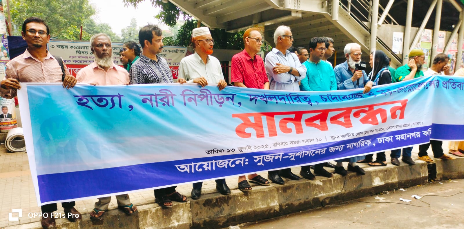 আজ সুশাসনের জন্য নাগরিক সুজনের ঢাকা মহানগরী ও ঢাকা জেলা শাখার যৌথ উদ্যোগে বর্তমান সময়ের উদ্বেগজনক সামাজিক পরিস্থিতি—বিশেষ করে খুন, নারী নির্যাতন, চাঁদাবাজি ও মব ভায়োলেন্স প্রতিরোধে জনসচেতনতা তৈরির লক্ষ্যে মানববন্ধন অনুষ্ঠিত হয়।