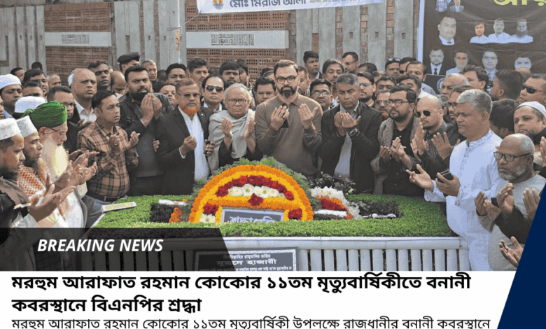 মুক্তমন রিপোর্ট : মরহুম আরাফাত রহমান কোকোর ১১তম মৃত্যুবার্ষিকী উপলক্ষে রাজধানীর বনানী কবরস্থানে তাঁর কবরে ফুল দিয়ে শ্রদ্ধা নিবেদন করেছে বাংলাদেশ জাতীয়তাবাদী দল (বিএনপি)। শ্রদ্ধা নিবেদনকালে বিএনপির যুগ্ম মহাসচিব রুহুল কবির রিজভীসহ ঢাকা মহানগর উত্তর বিএনপির নেতৃবৃন্দ উপস্থিত ছিলেন।