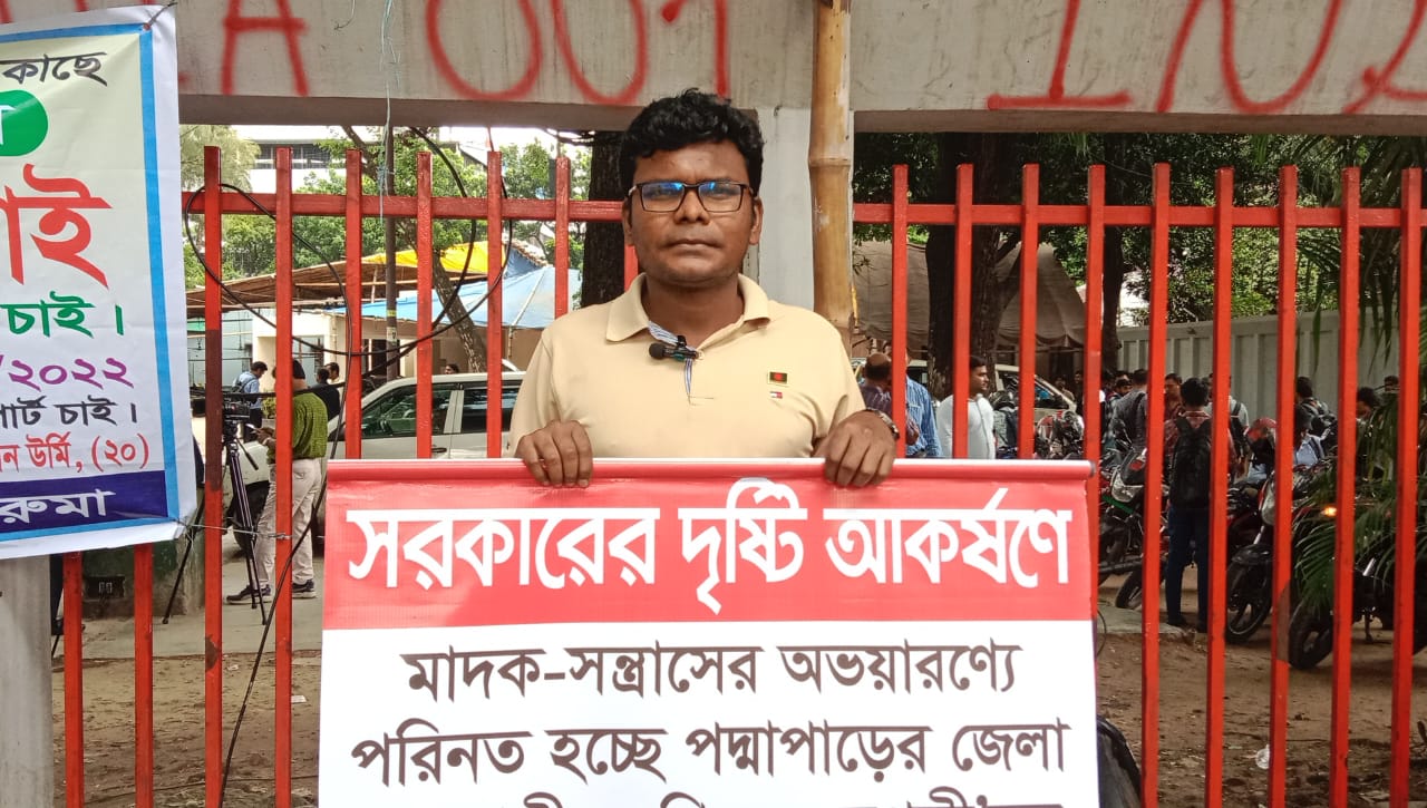 কর্মসূচি থেকে রাজিব বলেন, ‘দিনদিন আমার প্রিয় মাতৃভূমি রাজবাড়ী জেলা ভয়াবহ মাদকের আক্রমণে ধ্বংসের দিকে যাচ্ছে। মানুষ নিরাপত্তাহীনতায় ভুগছে। তরুণ প্রজন্ম ধ্বংস হয়ে যাচ্ছে। অথচ প্রশাসনের দৃশ্যমান কোনো উদ্যোগ নেই। শুধু নামমাত্র অভিযান চলছে। কিন্তু বড় অপরাধীরা ধরাছোঁয়ার বাইরে। আমি এই অবস্থার প্রতিবাদ জানাতে এবং রাষ্ট্রের দৃষ্টি আকর্ষণের জন্যই এখানে দাঁড়িয়েছি।’