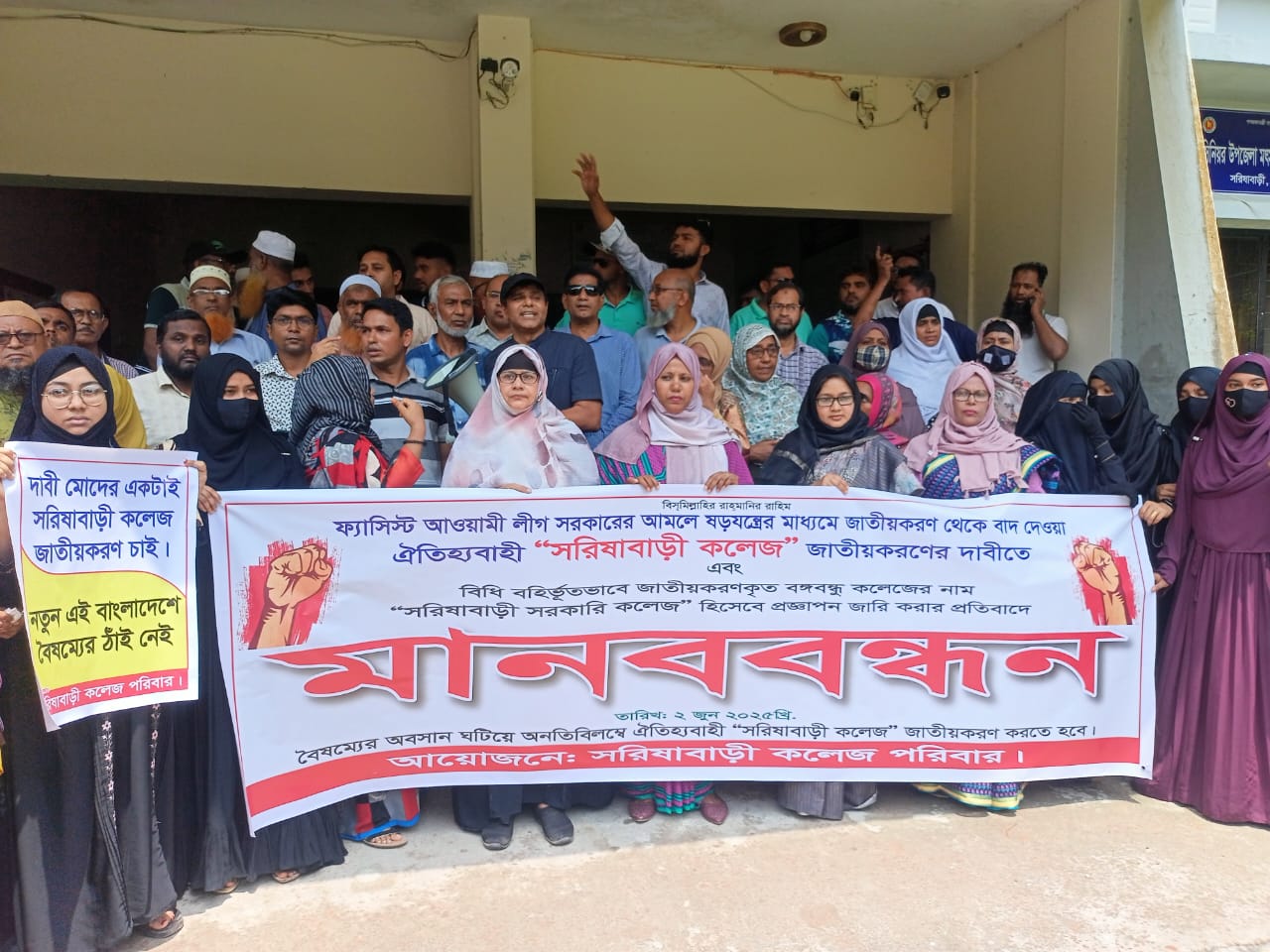 সোমবার (২ জুন) সকালে সরিষাবাড়ী পৌরসভার সামনে মহা-সড়কে বৈষম্যের শিকার হওয়া সরিষাবাড়ী কলেজ কতৃর্পক্ষ ঘন্টাব্যাপী এ মানববন্ধন করেন।