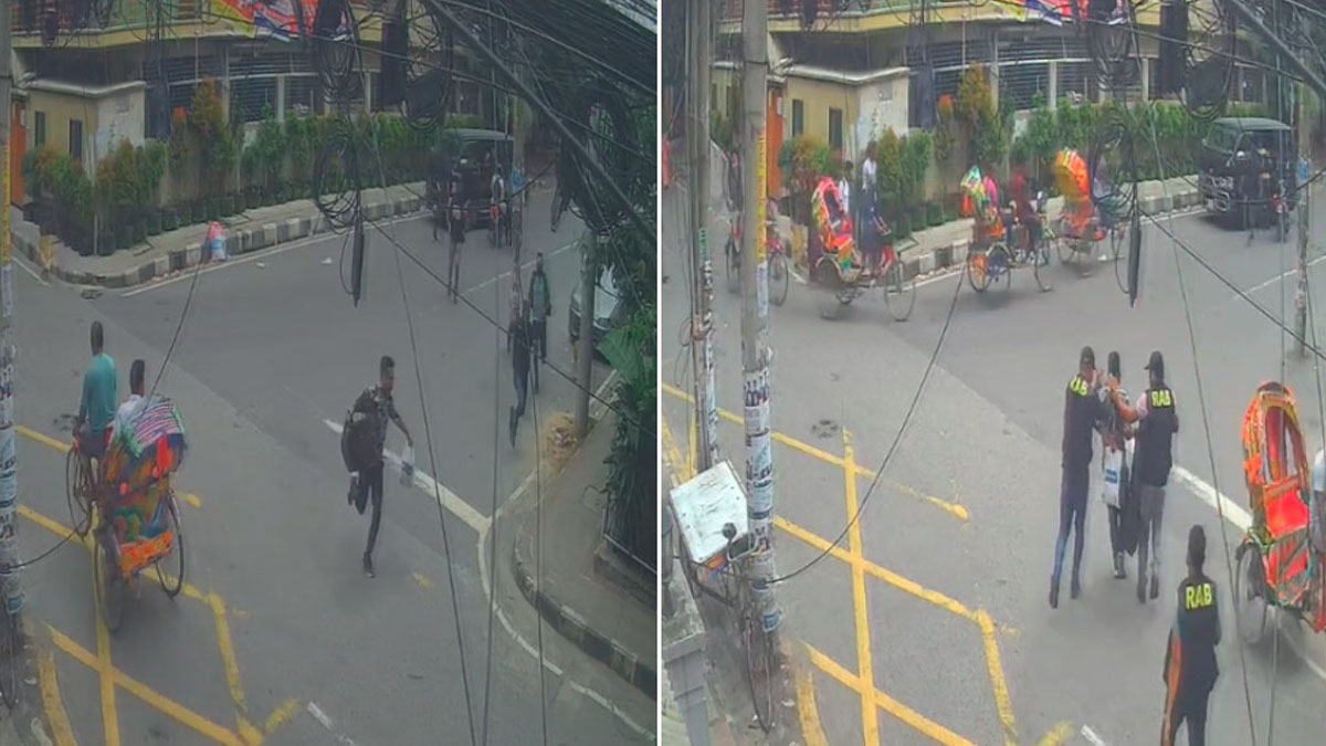 এসময় মোটরসাইকেলের পেছনে বসা ব্যক্তি ব্যাগটি নিয়ে দৌড় দেয়। এরপর র্যাবের জ্যাকেট (কোটি) পরা লোকেরা দৌড়ে তাকে ধরে ফেলে। এ সময় ছিনতাইকারীদের হাতে ছোট আগ্নেয়াস্ত্র দেখা যায়।