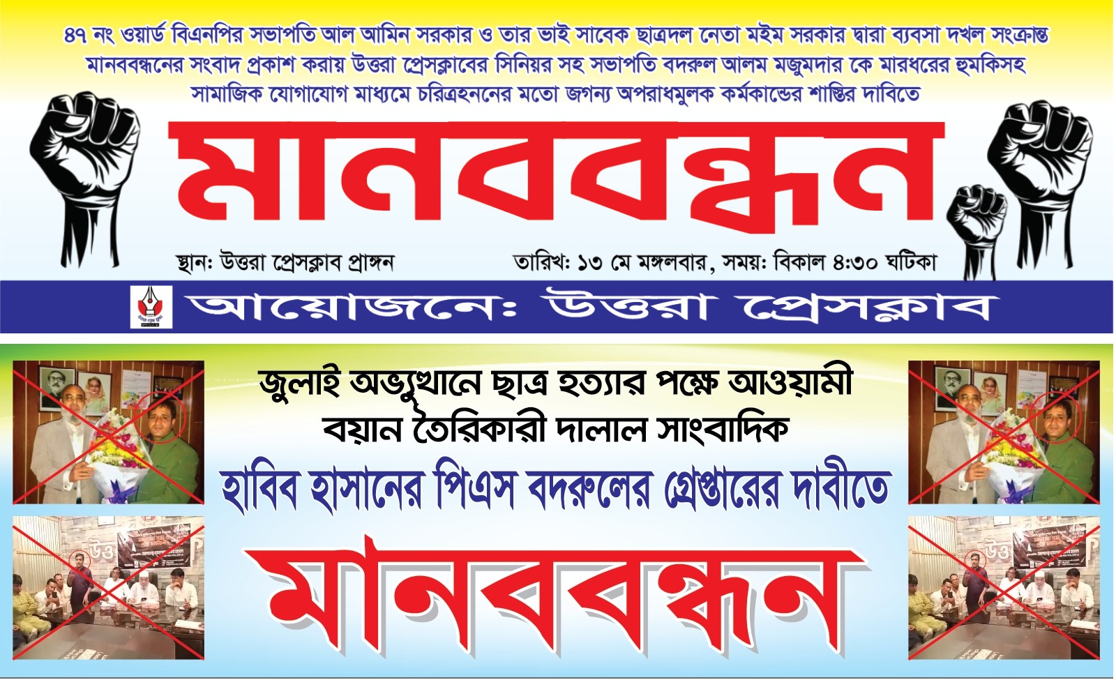 অতএব উত্তরা প্রেসক্লাবের যত সাংবাদিক ভাই ও বোনেরা আছেন তারা অবশ্যই আজকে প্রেসক্লাবের সামনে মানববন্ধনে যোগ দিবেন। আমরা যদি একতাবদ্ধ থাকতে না পারি তাহলে অদূর ভবিষ্যতে আমাদের অস্তিত্ব টিকে রাখা কঠিন হয়ে দাঁড়াবে।
