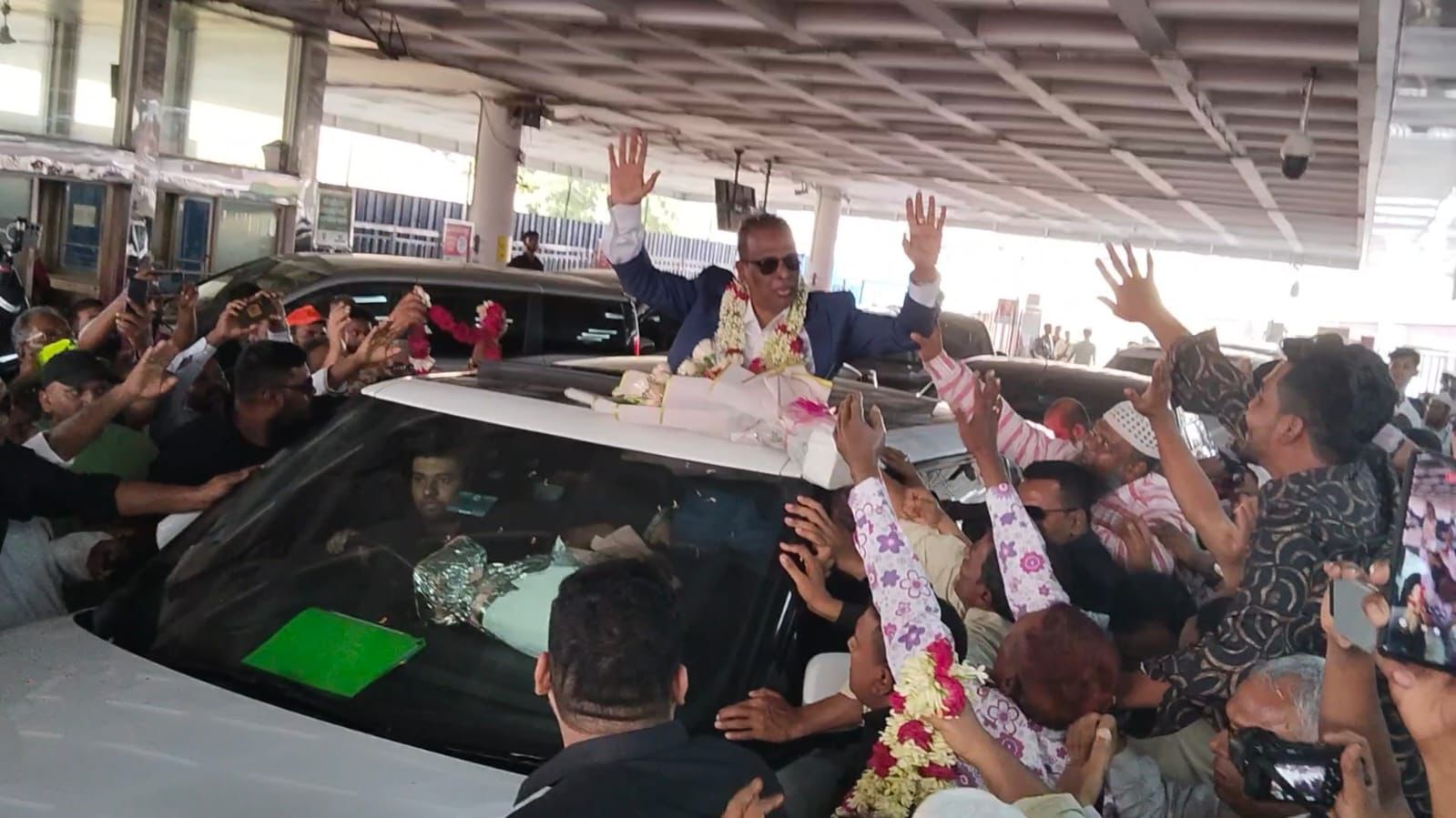 হযরত শাহাজালাল আন্তর্জাতিক বিমানবন্দরে সকাল ১০ টা থেকে হাজার হাজার বিএনপির নেতাকর্মী এবং সারাদেশ থেকে আসা হানিফ পরিবহনের কর্মকর্তা ও কর্মচারী উপস্থিত ছিলেন। বিকেল ৪ টা ১৫ মিনিটের দিকে তিনি ইমিগ্রেশনের কার্যক্রম শেষ করে ১ নং টার্মিনালের ভিতর দিয়ে ছাদখোলা জীপে চড়ে বাইরে বেরিয়ে আহেন। এসময় উপস্থিত নেতাকর্মীরা তাঁকে ফুলের তোড়া ও মালা দিয়ে বরণ করে নেন। গাড়ি থেকেই হাত তুলে জনগনের প্রতি কৃতজ্ঞতা জ্ঞাপন করেন মোঃ হানিফ। গণমানুষের ভালোবাসায় সিক্ত হয়ে দেশের সার্থে সবাইকে ঐক্যবদ্ধ থাকার আহ্বান জানান মো. হানিফ।