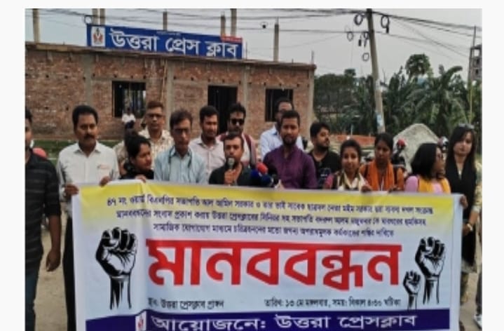 আজ মঙ্গলবার (১৩ মে) বিকাল ৫টায় উত্তরা ১২ নম্বর সেক্টরের খালপাড়ে অবস্থিত উত্তরা প্রেসক্লাবের সামনে এই মানববন্ধন অনুষ্ঠিত হয়। এতে বক্তারা অভিযুক্ত বিএনপি নেতা আল আমিন সরকার ও তার ভাই মইম সরকারকে দ্রুত আইনের আওতায় আনার দাবি জানান তারা।