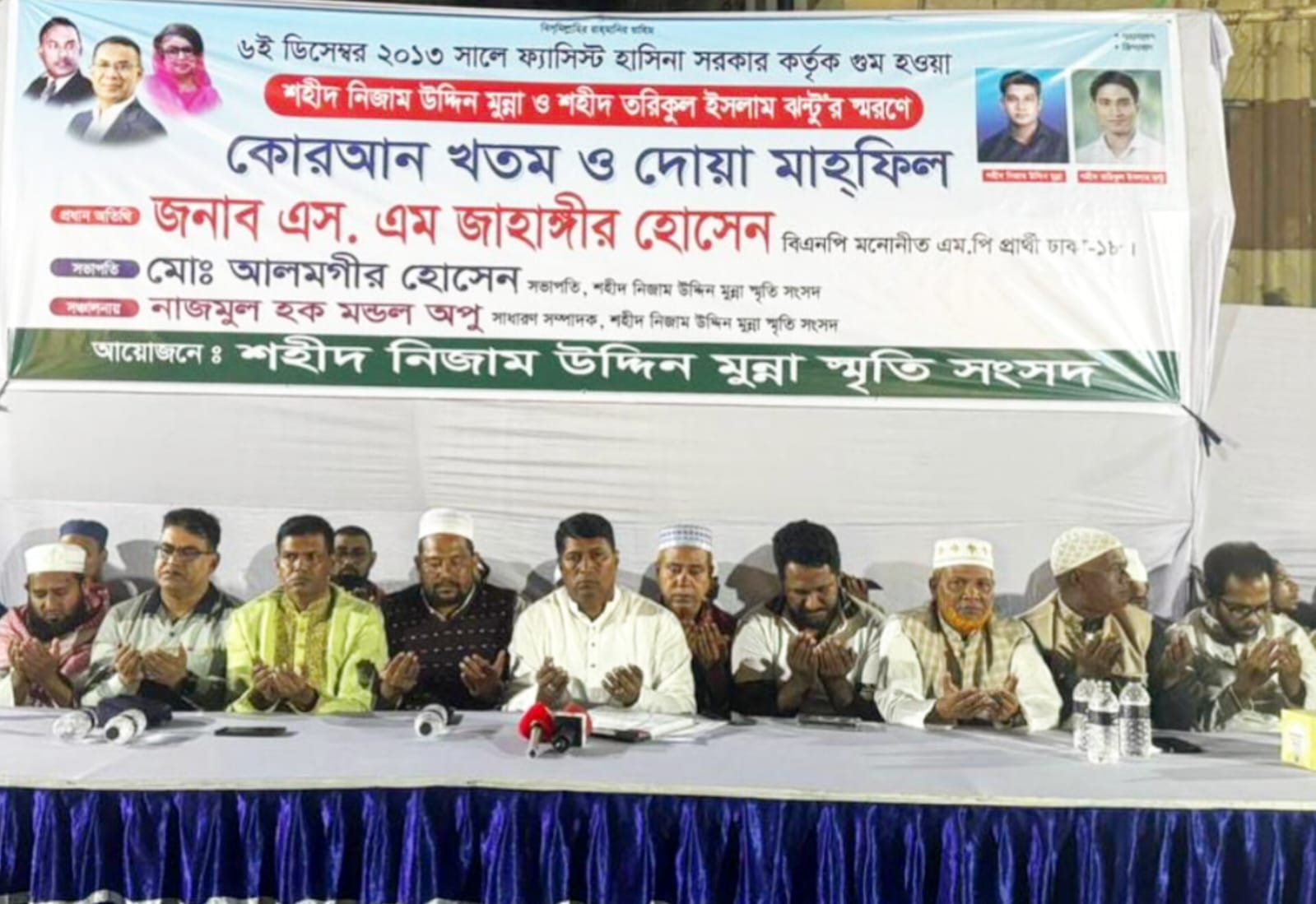 শহীদ নিজাম উদ্দিন মুন্না স্মৃতি সংসদের সাধারণ সম্পাদক নাজমুল হক মন্ডল অপু এর সঞ্চালনায় শহীদ নিজাম উদ্দিন মুন্না স্মৃতি সংসদের সভাপতি ও বিমানবন্দর থানা যুবদলের সাবেক সাধারণ সম্পাদক মোঃ আলমগীর হোসেন এর সভাপতিত্বে কুরআন খতম ও দোয়া মাহফিলে প্রধান অতিথি ছিলেন ঢাকা মহানগর উত্তর বিএনপির যুগ্ন আহবায়ক ও ঢাকা ১৮ আসনে ধানের শীষের প্রার্থী এস এম জাহাঙ্গীর হোসেন।