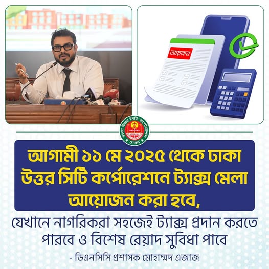 মুক্তমন রিপোর্ট : আগামী ১১ মে ২০২৫ থেকে ঢাকা উত্তর সিটি কর্পোরেশনে (ডিএনসিসি) ট্যাক্স মেলা আয়োজন করা হচ্ছে। যেখানে নাগরিকরা সহজেই ট্যাক্স প্রদান করতে পারবে ও বিশেষ রেয়াদ সুবিধা পাবে বলে ডিএনসিসি সূত্রে নিশ্চিত করা হয়েছে।