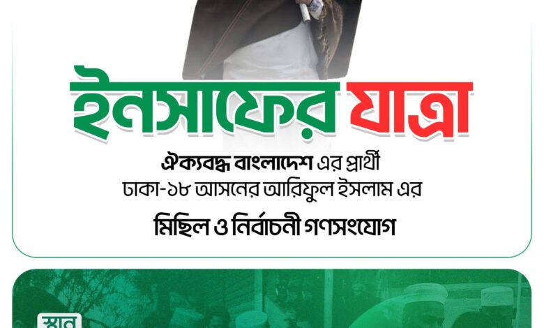 ইনসাফের যাত্রা: ঢাকা-১৮ আসনে আরিফুল ইসলামের মিছিল ও নির্বাচনী গণসংযোগ