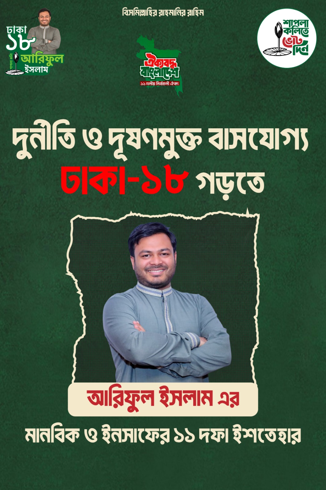 ঢাকা-১৮ আসনকে একটি মানবিক, নিরাপদ ও ইনসাফভিত্তিক আধুনিক নগরীতে রূপান্তরের লক্ষ্যে ১১ দফা ইশতেহার ঘোষণা করেছেন আরিফুল ইসলাম। “বিসমিল্লাহির রাহমানির রাহিম” বলে শুরু করা এই ইশতেহারে স্বাস্থ্য, শিক্ষা, যানজট, আবাসন, নারী-শ্রমিক অধিকার থেকে শুরু করে পরিবেশ ও শিশু উন্নয়ন—সব খাতকে অন্তর্ভুক্ত করা হয়েছে।