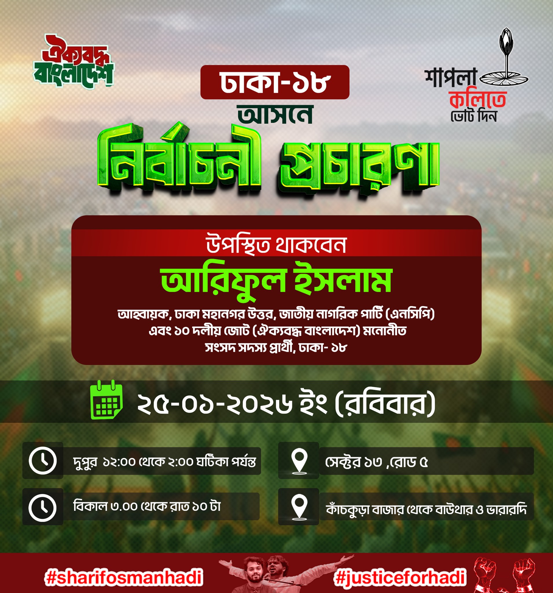 ত্রয়োদশ জাতীয় সংসদ নির্বাচনকে সামনে রেখে ঢাকা-১৮ আসনে নির্বাচনী প্রচারণা শুরু করেছেন ১০ দলীয় জোট মনোনীত প্রার্থী ও জাতীয় নাগরিক পার্টি (এনসিপি)-এর ঢাকা মহানগর উত্তর আহ্বায়ক আরিফুল ইসলাম। রোববার (২৫ জানুয়ারি ২০২৬) দিনব্যাপী ঢাকা-১৮ আসনের বিভিন্ন এলাকায় তাঁর নির্বাচনী প্রচারণা ও গণসংযোগ কর্মসূচি অনুষ্ঠিত হবে।