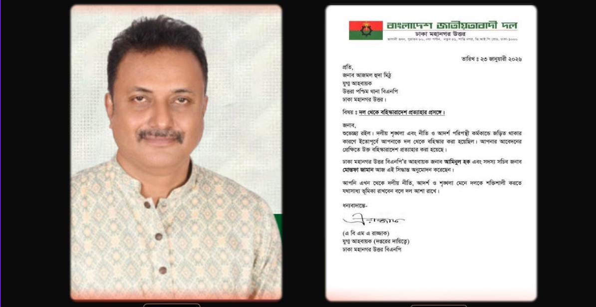 ২৩ জানুয়ারি বিএনপির ঢাকা মহানগর উত্তর শাখার আহ্বায়ক আমিনুল হক ও সদস্য সচিব মোস্তফা জামান দলীয় আদেশে এই প্রত্যাহারে অনুমোদন করেছেন বলে দলের মহানগর শাখার দপ্তরের দায়িত্বে থাকা যুগ্ম আহ্বায়ক এ বি এম এ রাজ্জাক স্বাক্ষরিত এক বিজ্ঞপ্তিতে এই তথ্য জানানো হয়।