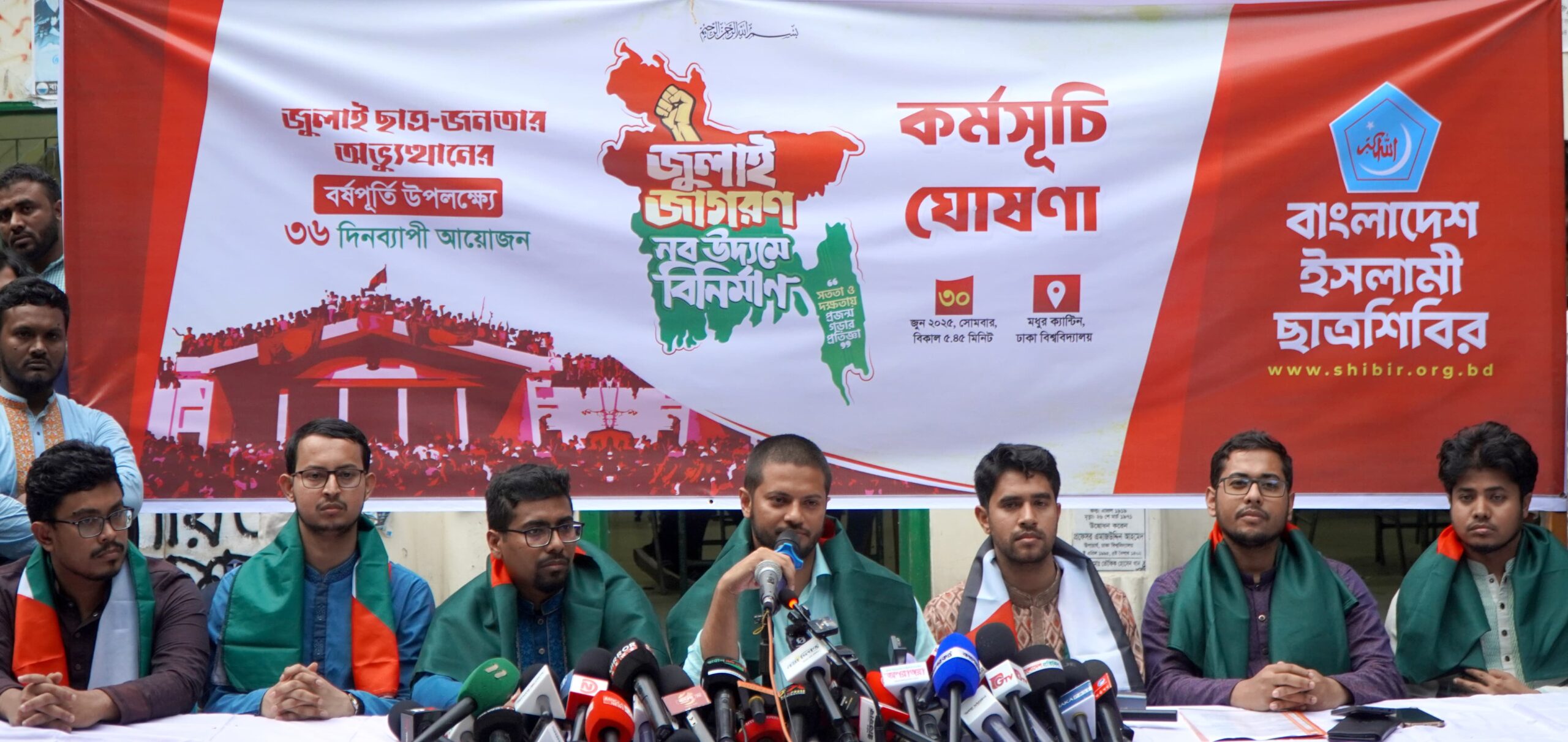 মুক্তমন ডেস্ক : সততা ও দক্ষতায় প্রজন্ম গড়ার প্রতিজ্ঞায় “জুলাই জাগরণ নব উদ্যমে বিনির্মাণ” এই প্রতিপাদ্যকে সামনে রেখে জুলাই অভ্যুত্থানের বর্ষপূর্তি উপলক্ষে ৩৬ দিনব্যাপী কর্মসূচি ঘোষণা করেছে বাংলাদেশ ইসলামী ছাত্রশিবির। আজ (সোমবার) বিকেল ৫:৪৫ টায় ঢাকা বিশ্ববিদ্যালয়ের মধুর ক্যান্টিনে ছাত্রশিবিরের কেন্দ্রীয় সভাপতি জাহিদুল ইসলাম এক সংবাদ সম্মেলনের মাধ্যমে এ কর্মসূচি ঘোষণা করেন।