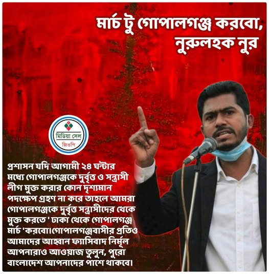 প্রশাসন যদি আগামী ২৪ ঘন্টার মধ্যে গোপালগঞ্জকে দুর্বৃত্ত ও সন্ত্রাসী লীগ মুক্ত করার কোন দৃশ্যমান পদক্ষেপ গ্রহণ না করে তাহলে আমরা গোপালগঞ্জকে দুর্বৃত্ত সন্ত্রাসীদের থেকে মুক্ত করতে ' ঢাকা থেকে গোপালগঞ্জ মার্চ 'করবো।গোপালগঞ্জবাসীর প্রতিও আমাদের আহ্বান ফ্যাসিবাদ নির্মূল আপনারাও আওয়াজ তুলুন, পুরো বাংলাদেশ আপনাদের পাশে থাকবে। "