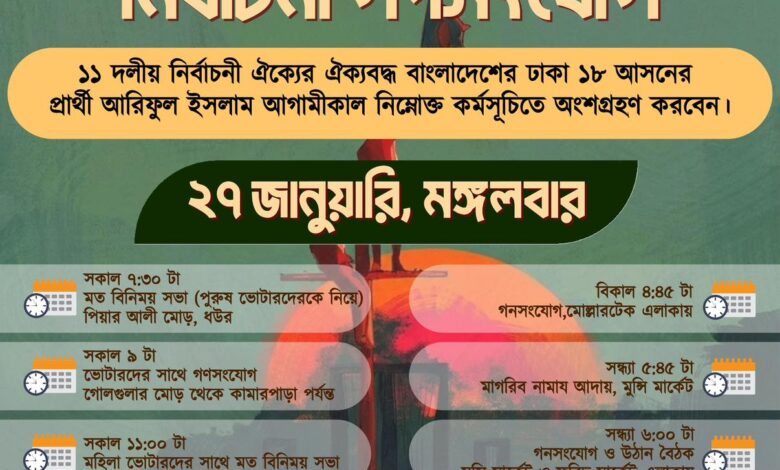 ঢাকা-১৮ সংসদীয় আসনে একবদ বাংলাদেশ ও ১১ দলীয় নির্বাচনী জোট মনোনীত প্রার্থী আরিফুল ইসলাম আজ মঙ্গলবার (২৭ জানুয়ারি) দিনব্যাপী নির্বাচনী গণসংযোগ ও কর্মসূচিতে অংশ নিচ্ছেন।
