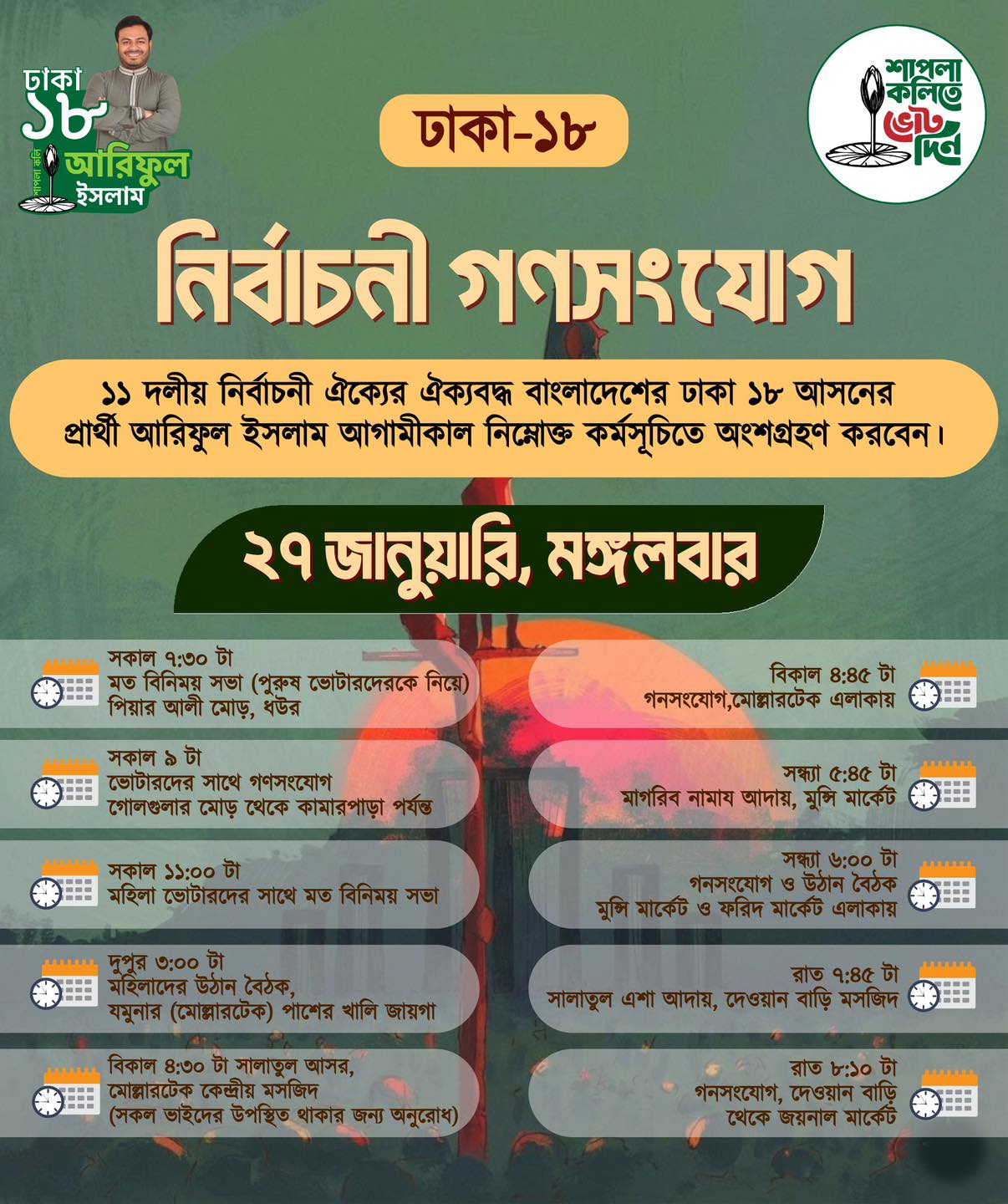 ঢাকা-১৮ সংসদীয় আসনে একবদ বাংলাদেশ ও ১১ দলীয় নির্বাচনী জোট মনোনীত প্রার্থী আরিফুল ইসলাম আজ মঙ্গলবার (২৭ জানুয়ারি) দিনব্যাপী নির্বাচনী গণসংযোগ ও কর্মসূচিতে অংশ নিচ্ছেন।