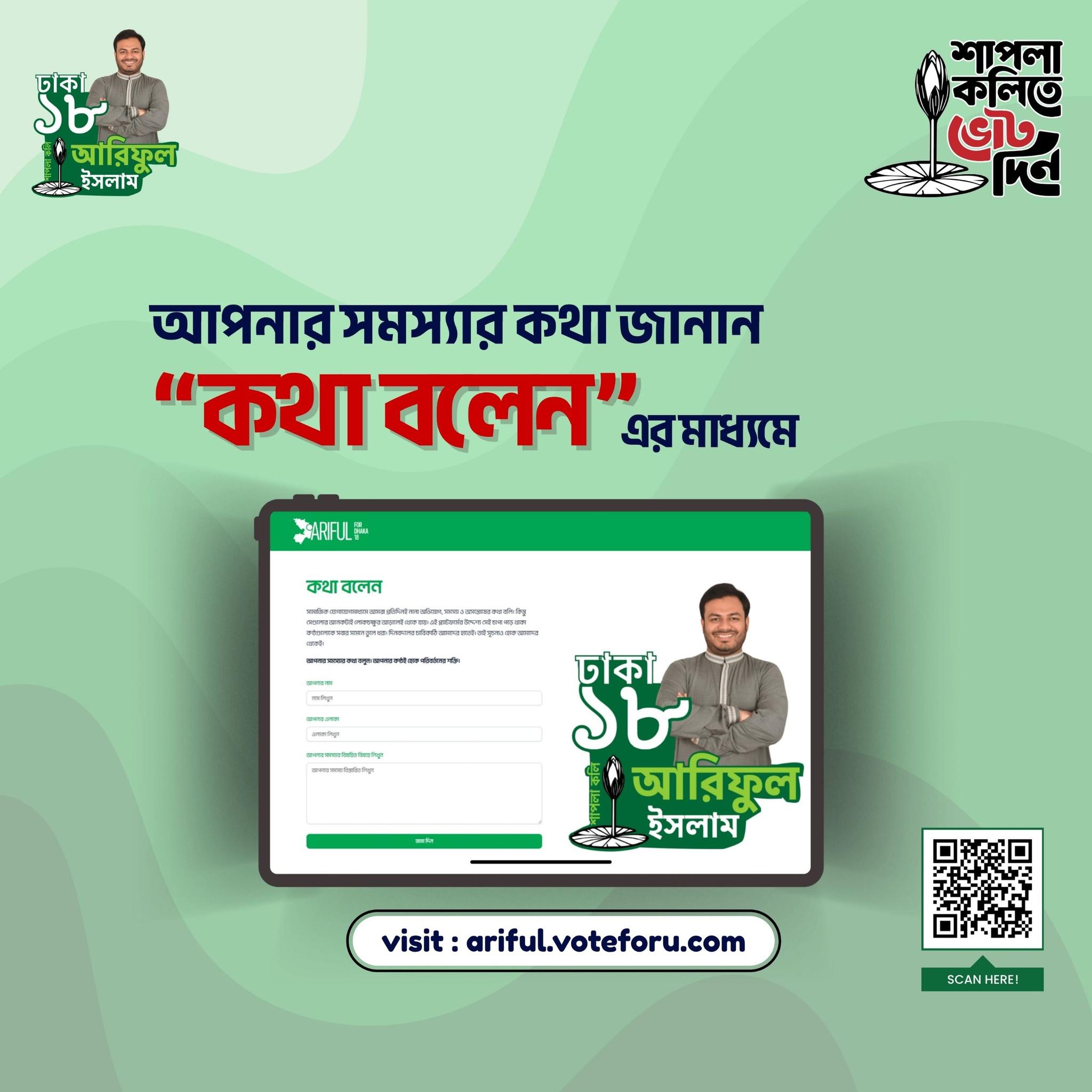 আগ্রহী নাগরিকরা নির্দিষ্ট ওয়েবসাইটে ভিজিট করে অথবা কিউআর কোড স্ক্যানের মাধ্যমে পোর্টালটিতে প্রবেশ করে নিজেদের মতামত জানাতে পারবেন। বর্তমানে ঢাকা-১৮ আসনে বিভিন্ন প্রার্থীর নির্বাচনী প্রচারণার পাশাপাশি নাগরিক সম্পৃক্ততামূলক উদ্যোগও লক্ষ্য করা যাচ্ছে।