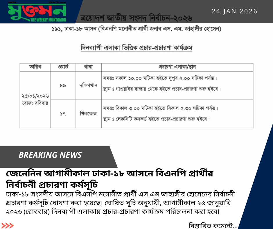 Contact : +8801822288799 (WhatsApp), E-mail : muktomonnews@gmail.com, Office : 56, A.H Tower (4th Floor), Sector-3, Road-2, Azampur, Uttara, Dhaka-1230.