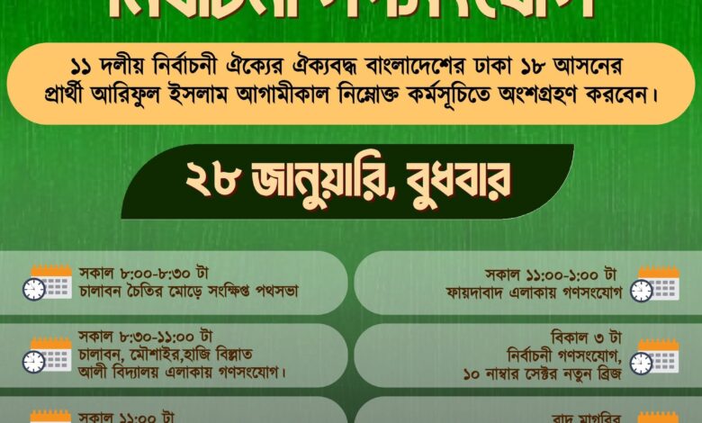 ঢাকা-১৮ আসনে ১১ দলীয় জোটের প্রার্থী আরিফুল ইসলামের দিনব্যাপী নির্বাচনী গণসংযোগ আজ
