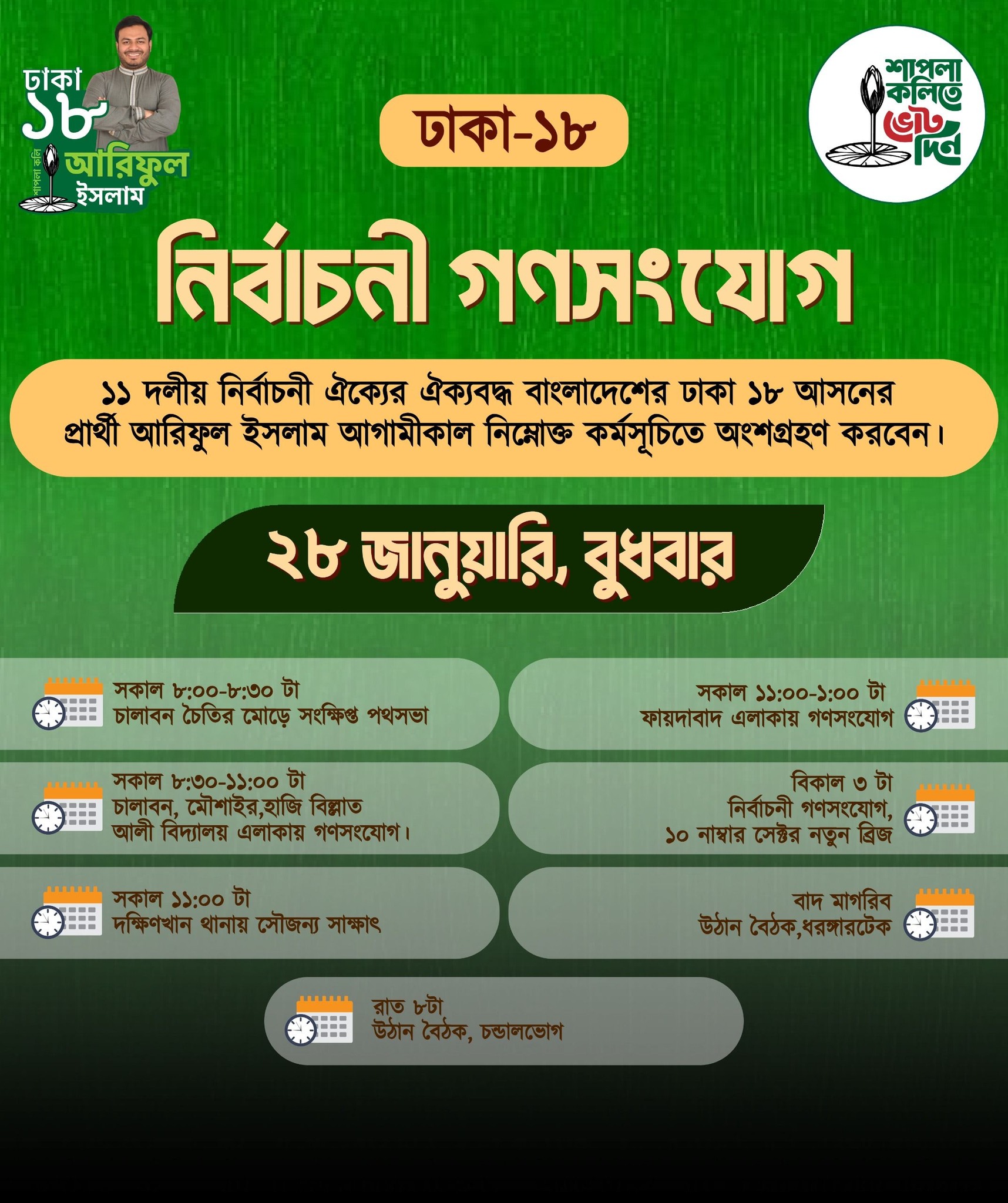 আসন্ন জাতীয় সংসদ নির্বাচনকে সামনে রেখে ঢাকা-১৮ আসনে গণসংযোগ কার্যক্রম জোরদার করেছে জামায়াত-এনসিপি সহ ১১ দলীয় জোট। এরই ধারাবাহিকতায় আজ বুধবার (২৮ জানুয়ারি) দিনব্যাপী নির্বাচনী গণসংযোগে অংশ নেবেন জোট মনোনীত প্রার্থী আরিফুল ইসলাম।
