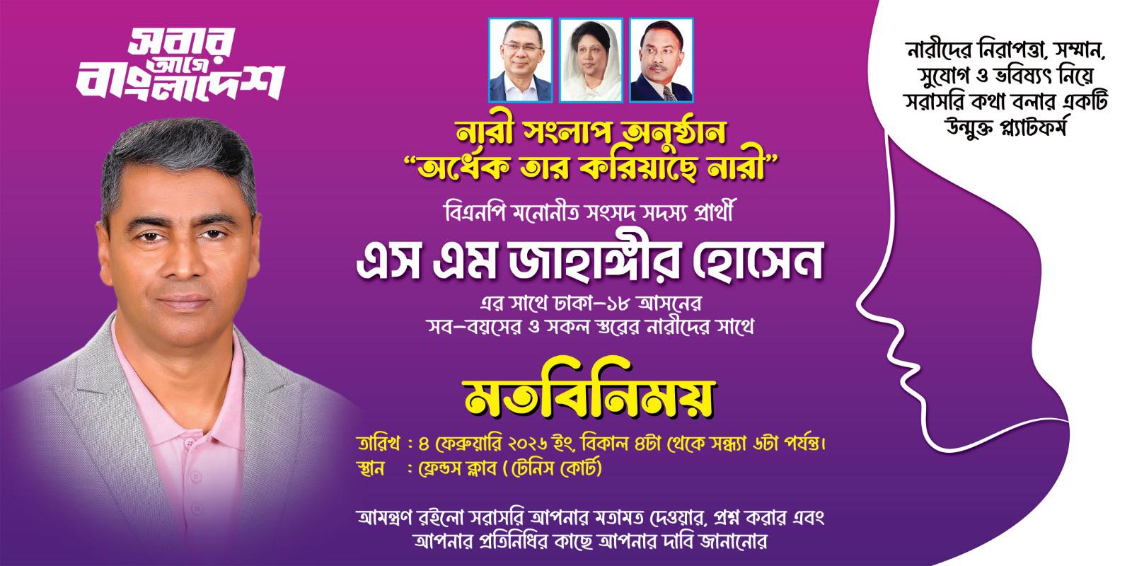 মুক্তমন রিপোর্ট :নারীদের নিরাপত্তা, সম্মান, সুযোগ ও ভবিষ্যৎ নিয়ে সরাসরি আলোচনা ও মতবিনিময়ের লক্ষ্যে আয়োজন করা হয়েছে নারী সংলাপ অনুষ্ঠান “অর্ধেক তার করিয়াছে নারী”। এই উন্মুক্ত সংলাপ অনুষ্ঠানে ঢাকা-১৮ আসনের বিএনপি মনোনীত সংসদ সদস্য প্রার্থী এস এম জাহাঙ্গীর হোসেন নারীদের সঙ্গে সরাসরি কথা বলবেন।