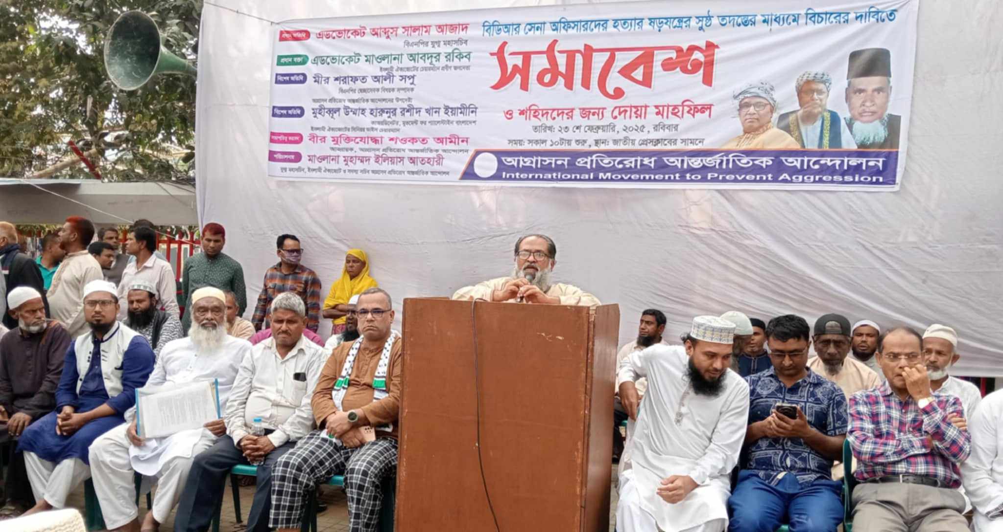 আগ্রাসন প্রতিরোধ আন্তর্জাতিক আন্দোলনের আহ্বায়ক ও ইসলামী ঐক্যজোটের ভাইস চেয়ারম্যান বীর মুক্তিযোদ্ধা মাওলানা শওকত আমীনের সভাপতিত্বে সমাবেশে বক্তব্যে রাখেন বিএনপির যুগ্ম মহাসচিব এডভোকেট আবদুস সালাম আজাদ, মুভমেন্ট ফর প্যালেস্টাইন বাংলাদেশের কো-অর্ডিনেটর হারন অর রশিদ খান, সমাজতান্ত্রিক মজদুর পার্টির সাধারণ সম্পাদক শামসুল আলম, নাগরিক পরিষদের আহ্বায়ক মোহাম্মদ শামসুদ্দিন, বাংলাদেশ জাস্টিস পার্টির চেয়ারম্যান আবুল কাশেম মজুমদার, বাংলাদেশের নাগরিক পরিষদের সভাপতি আবদুল আহাদ নুর, লেবার পার্টির ঢাকা মহানগর সভাপতি হুমায়ুন কবির, আগ্রাসন প্রতিরোধ আন্তর্জাতিক আন্দোলন সদস্য সচিব মাওলানা মোহাম্মদ ইলিয়াস আতাহারি প্রমুখ।