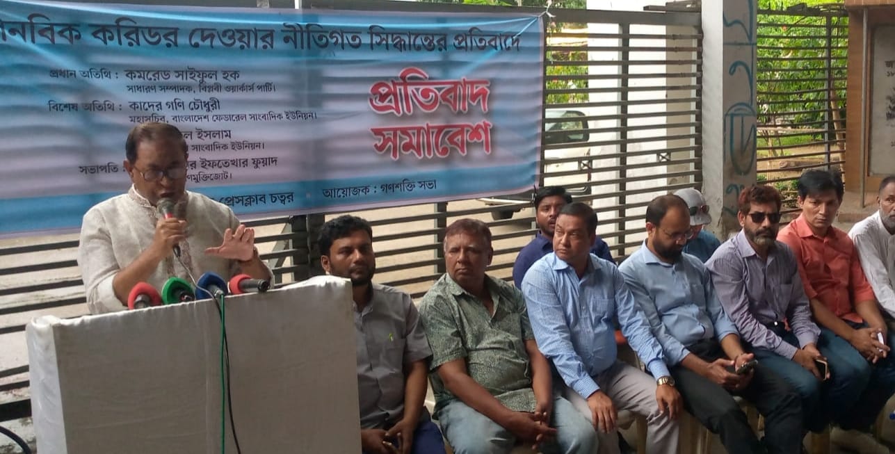 জাতীয় প্রেসক্লাব চত্বরে অনুষ্ঠিত প্রতিবাদ সমাবেশে সভাপতিত্ব করেন গণশক্তি সভার সভাপতি সাংবাদিক সাদেক রহমান। সভাপতির বক্তব্যে সাদেক রহমান বলেন, আমাদেরকে সতর্ক থাকতে হবে যাতে এই অঞ্চল অস্থিতিশীল হয়ে না উঠে। সব গুরুত্বপূর্ণ পক্ষগুলোর সাথে আলাপ না করে মানবিক করিডোর দেয়ার সিদ্ধান্ত হবে বিপদজনক।