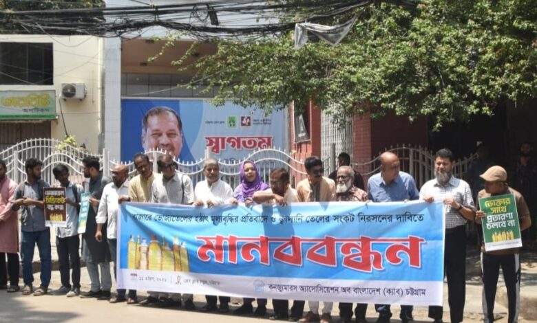 মুক্তমন রিপোর্ট : ভোজ্যতেল, জ্বালানীতেলসহ নিত্যপ্রয়োজনীয় পণ্যের বাজারে অসাধু ব্যবসায়ীদের কারসাজি ও কৃত্রিম সংকট সৃষ্টির প্রতিবাদে চট্টগ্রামে মানববন্ধন কর্মসূচি পালন করেছে কনজুমারস অ্যাসোসিয়েশন অব বাংলাদেশ (ক্যাব)। শনিবার চট্টগ্রাম প্রেসক্লাব চত্বরে ক্যাব চট্টগ্রাম বিভাগ ও মহানগর কমিটির উদ্যোগে এ মানববন্ধন অনুষ্ঠিত হয়।