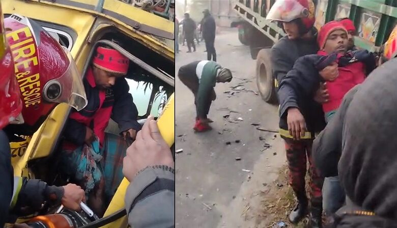 দুর্ঘটনাকবলিত গাড়িতে আটকে ছিলেন ২ চালক, ৯৯৯ নম্বরে ফোনকলে উদ্ধার ৪ জন